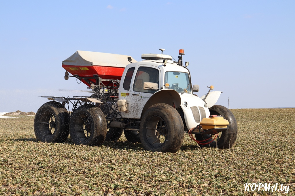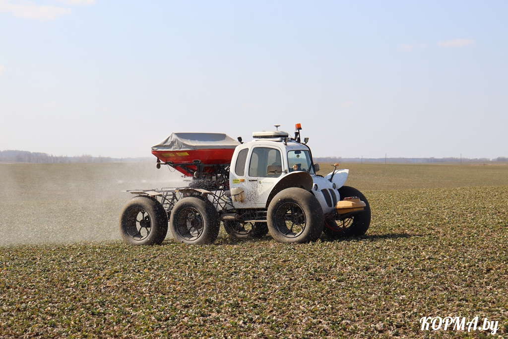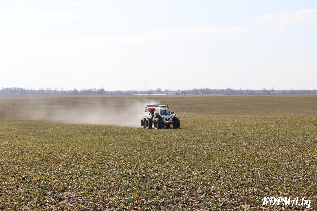 Озимые культуры, высаженные осенью прошлого года, также нуждаются в особенном уходе весной. Михаил Шкурат – за рулём лёгкой, быстрой и манёвренной «Росы», его брат Александр задействован на подвозе минеральных удобрений, а на загрузке трудится полеводческая бригада. Такой дружной командой гектар за гектаром они проводят подкормку озимого рапса минеральными удобрениями, способствующими активному росту растений, защите их от болезней и повышению урожайности.