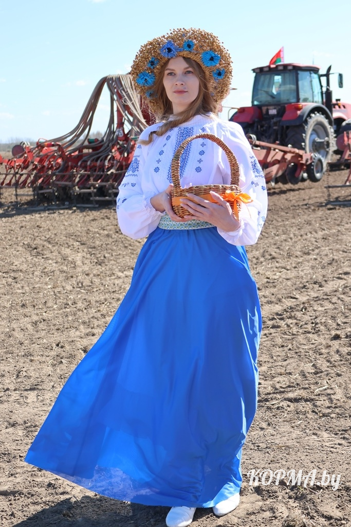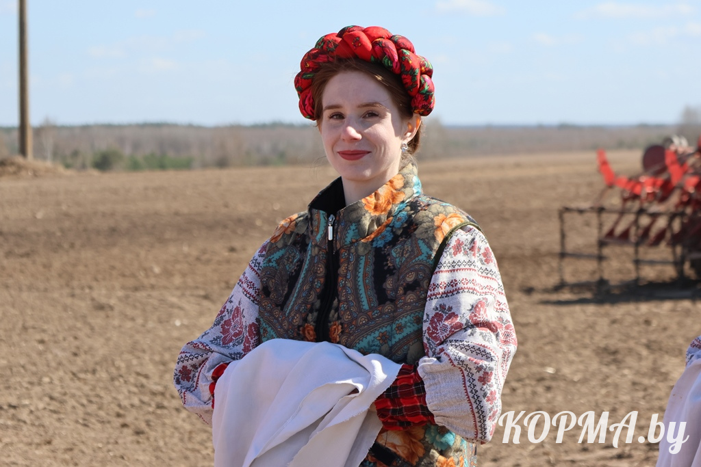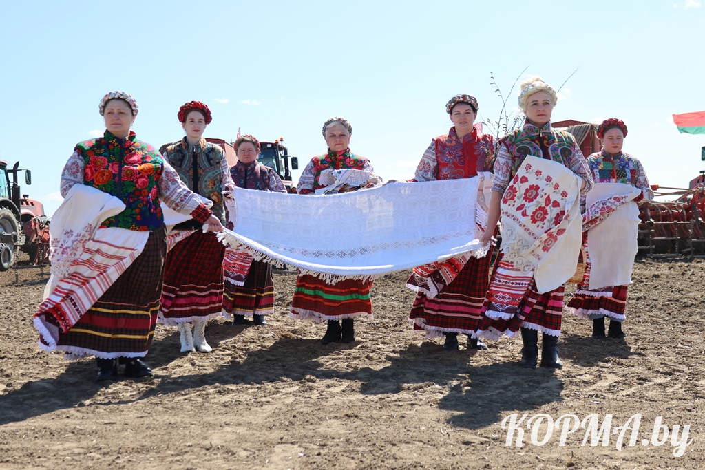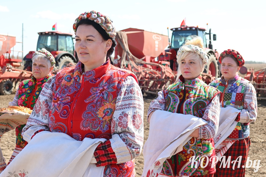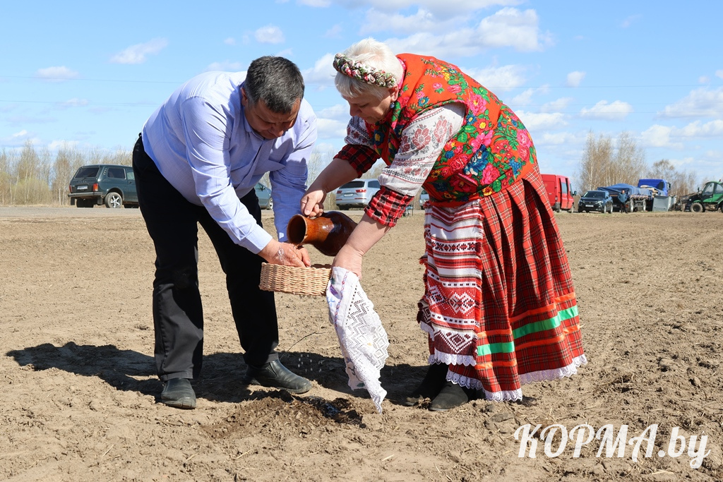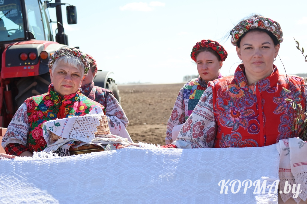 На свежевспаханном поле около деревни Сапожки Кормянского района собрались участники ритуала аграриев — льноводы, артисты, священнослужитель, руководство района, чтобы вместе попросить у Господа Всевышнего и земли-матушки хорошей погоды, исправной техники, благодатного настроения.