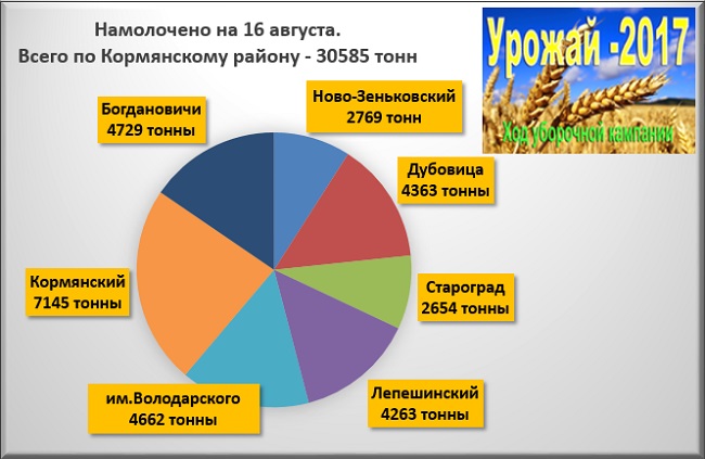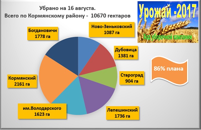 По сообщению диспетчерской службы управления сельского хозяйства и продовольствия по состоянию на 16 августа 2017 года площадь убранных полей — 10670 гектара, что к плану составляет 86 процент. Наибольшее количество площадей- по 98% убрали аграрии КСУП «Староград» и КСУП «Лепешинский». За этот день по району было убрано 578 гектаров.