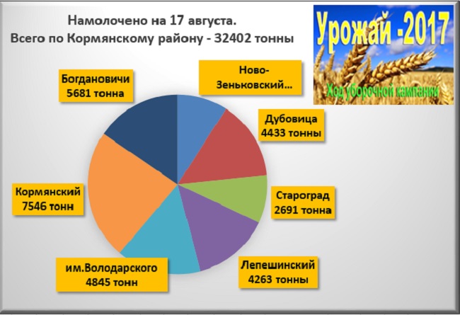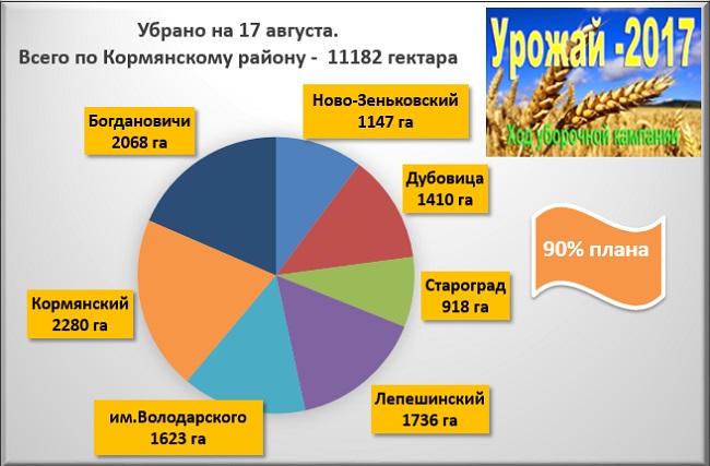 По сообщению диспетчерской службы управления сельского хозяйства и продовольствия по состоянию на 17 августа 2017 года площадь убранных полей — 11182 гектара, что к плану составляет 90 процентов. По 100% запланированного убрали аграрии КСУП «Староград» и КСУП «Совхоз «Кормянский». За этот день по району было убрано 512 гектаров.