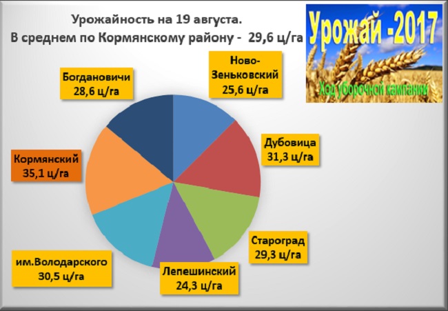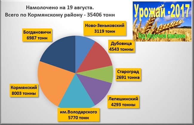 По сообщению диспетчерской службы управления сельского хозяйства и продовольствия по состоянию на 19 августа 2017 года площадь убранных полей — 11972 гектара, что к плану составляет 97 процентов. По 100% запланированного убрали аграрии следующих КСУПов: «Староград», «Совхоз «Кормянский», «Ново-Зеньковский», «им. Володарского», За этот день по району было убрано 263 гектара.