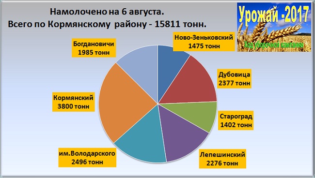 По сообщению диспетчерской службы управления сельского хозяйства и продовольствия по состоянию на 6 августа 2017 года площадь убранных полей — 5882 гектара, что к плану составляет 45 процентов. За этот день был убран 581 гектар. Всего по району предстоит убрать 13099 гектаров зерновых и зернобобовых культур. Средняя урожайность составляет 26,9 центнера с гектара. Самая высокая в КСУП «Дубовица» — 33,6 ц/га. Намолот всего по району уже составил 15811 тонн зерна, в том числе за 6 августа — 1843 тонны. По данным за 2016 год общий намолот по району был более 45 тысяч тонн зерна.