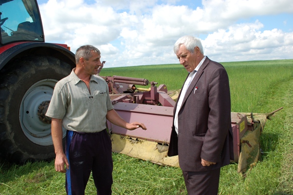 Массовая заготовка кормов начнется, примерно, в середине следующей недели. Однако в ряде сельскохозяйственных предприятий района приступили к косовице трав. Но таким, как филиал «Староград» ОАО «Кормаагросервис», пока нечего косить. Из трав в этом хозяйстве посеяна тимофеевка, клевер, которые еще убирать рано. Может быть поэтому, когда мы приехали с заместителем председателя Кормянского райисполкома, начальником управления сельского хозяйства и продовольствия В.Д. Андриановым в мехпарк филиала, на длинной скамье прохлаждались механизаторы вместе с главным инженером и главным агрономом. Как только наша машина въехала на территорию, началось движение, развилась бурная деятельность. Не дали мужикам передохнуть после «изнурительного труда».