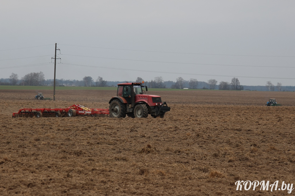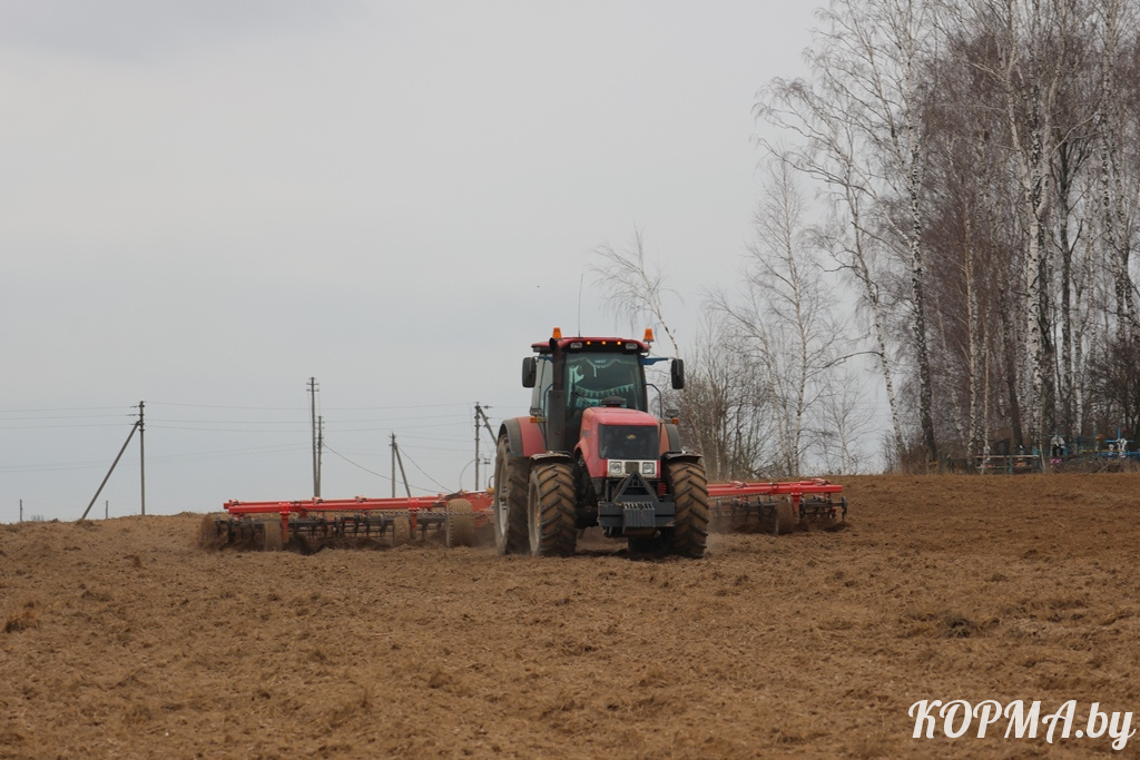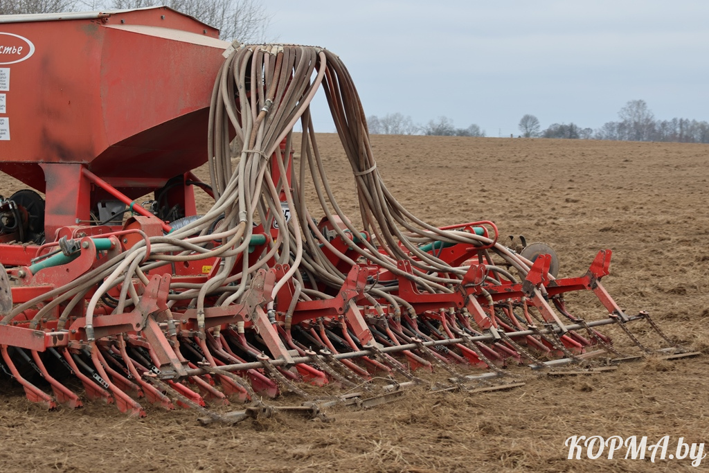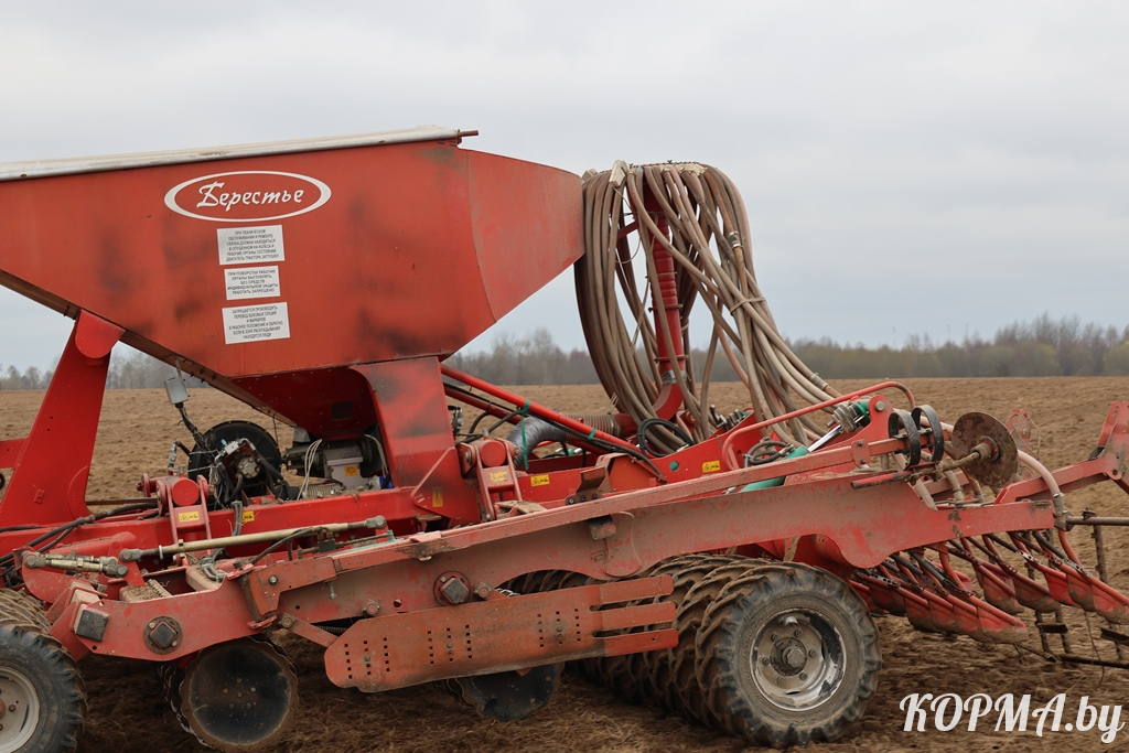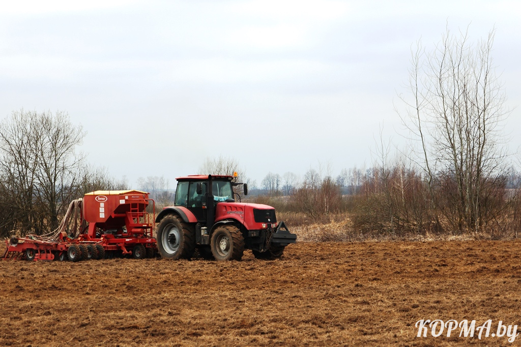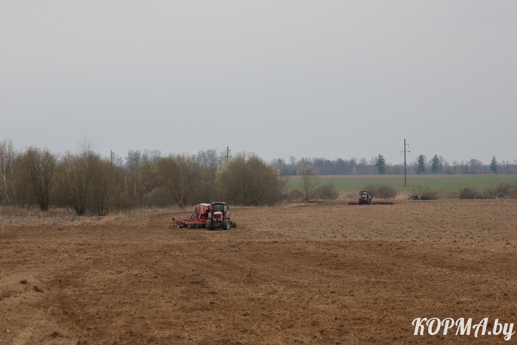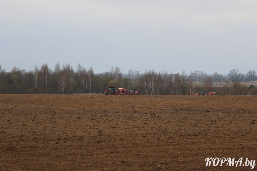 На часах начало одиннадцатого утра, а работа в поле началась ещё в семь и к этому часу кипит вовсю. Для того, чтобы успеть всё в срок, работники КУП «Кормалён» трудятся не покладая рук. На сегодняшний день в поле вышло 13 единиц техники: 2 культиватора и 4 посевных агрегата, 4 КПС и 3 ЭКМ. Всего в этом году должно быть засеяно 3012 гектаров, за один день посевной аграрии уже осилили 235 гектаров. Специалисты говорят: «Главное – чтобы погода не подвела».