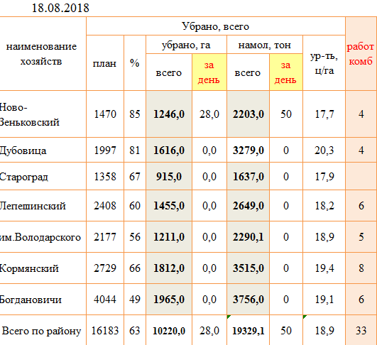 В сельскохозяйственных предприятиях района идет уборка зерновых и зернобобовых культур. Под рубрикой «Урожай-2018» мы публикуем сведения о ходе уборочной кампании 2018 года. Здесь можно ознакомиться с информацией об урожайности зерновых и зернобобовых. Узнать сколько намолочено зерна всего, в том числе за день, план уборки, сколько убрано всего гектаров, процентное отношение к плану, а также количество убранных гектаров за день, сколько работало в полях комбайнов и какая у них была выработка.