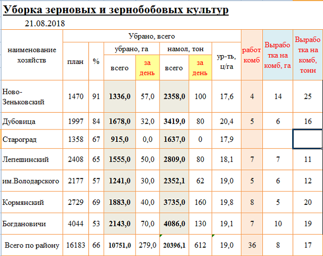 Сведения по уборке зерновых в сельхозпредприятиях Кормянского района по состоянию на 21 августа