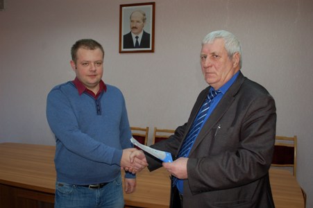Иван Анатольевич Науменко, председатель Кормянского райисполкома, принимал поздравление и сертификат на автомобиль «Шевроле Нива» и три трактора марки МТЗ-82.1 из рук председателя областного исполнительного комитета Владимира Андреевича Дворника.