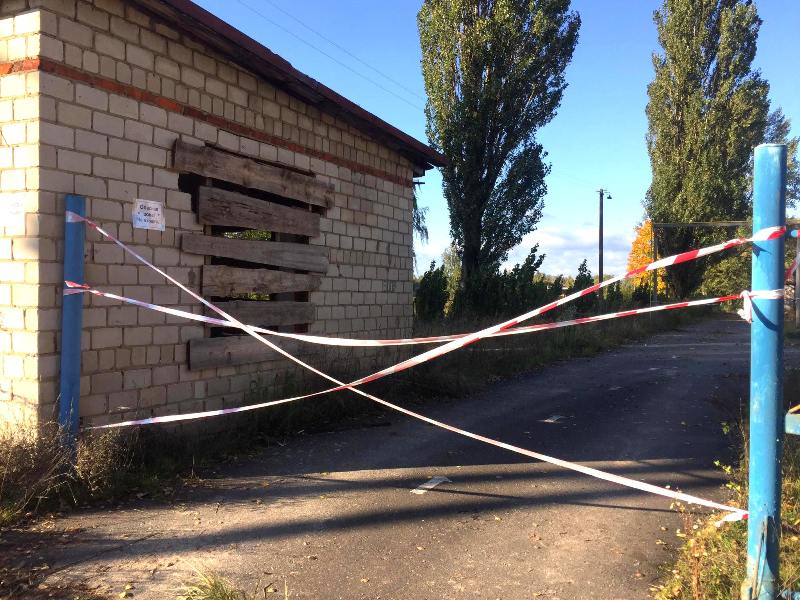 Подходя к заводу, уже издалека на входных воротах заметили ограждающую ленту. Приблизившись к бывшему пункту пропуска, увидели табличку с надписью «Проход запрещён!», прикреплённую на фасад здания, с торца была вторая – «Опасная зона! Не входить!». Когда мы пробрались (прошу заметить, с благой целью) на территорию завода, перед нами открылась следующая картина: ограничительной лентой перетянуты все проходы и проезды, входные двери и ворота в здания, на них также висели таблички с предупреждением об опасности. Изменилась в лучшую строну и ситуация с люками. Они закрыты щитами и поддонами и в силу этого стали более заметны. Тщательно осмотрев территорию, мы увидели, что вход в здание, где хранятся бочки с остатками мазута, заколочен деревянными рейками, а на фасаде есть предупреждающая табличка.