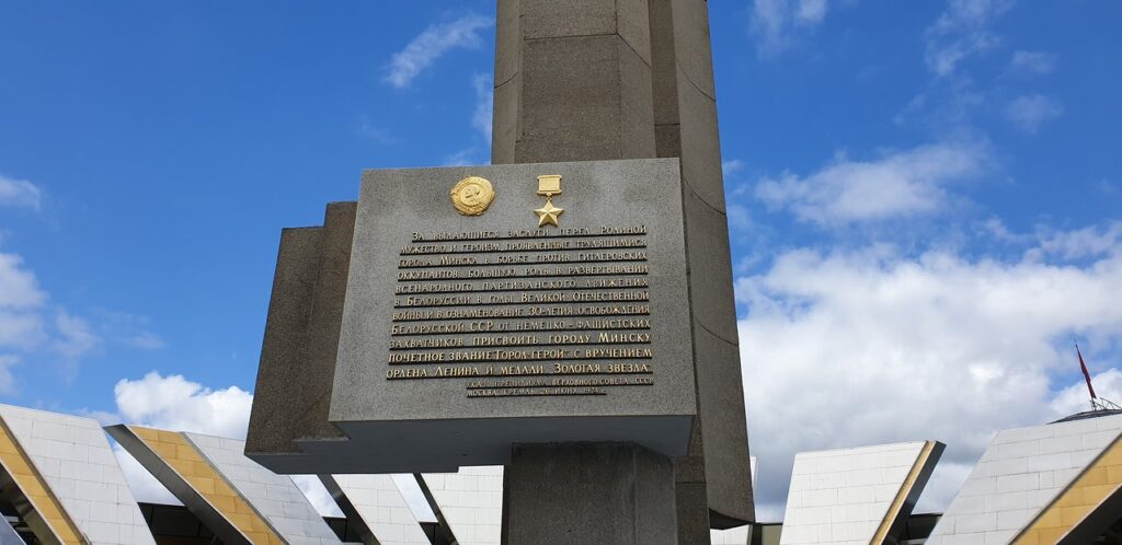 Яркие напоминания о мужестве и героизме, проявленные в борьбе с гитлеровскими оккупантами, – «Курган Славы», расположенный на подъезде к Минску, монумент на площади Победы, стела «Город-герой», возведённая на проспекте Победителей. Высота обелиска – 45 м. Вверху стелы установлена золотая звезда, внизу – плита с текстом о присвоении Минску почётного звания. Перед стелой — скульптура «Родина-мать» с фанфарами в поднятой руке. Расположенный здесь же Белорусский государственный музей истории Великой Отечественной войны хранит память о бессмертном подвиге нашего народа.