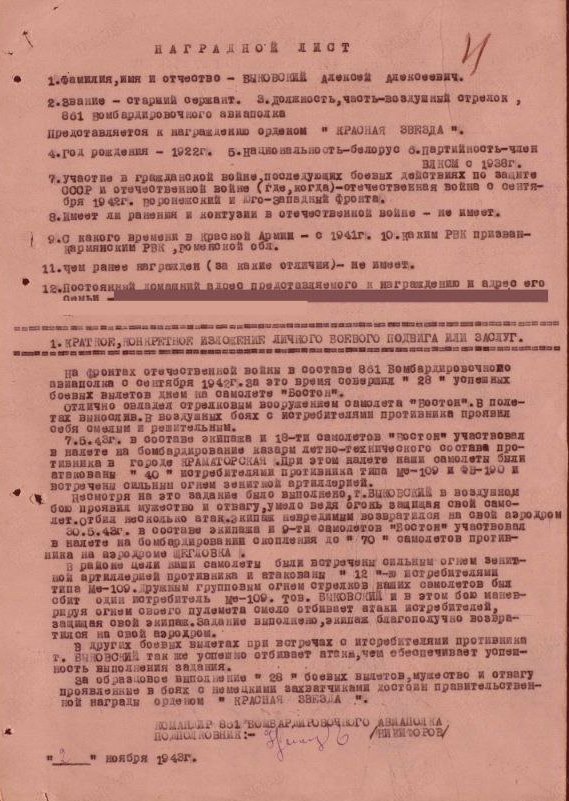К моменту награждения орденом Красной Звезды Алексей Алексеевич совершил почти три десятка успешных боевых вылетов днём на самолёте «Бостон». 7 мая 1943 года в составе экипажа и 18 самолётов участвовал в налёте на бомбардирование казарм лётно-технического состава противника в городе Краматорская. При этом налёте наши самолёты были атакованы 40 истребителями противника и встречены сильным огнём зенитной артиллерии. Несмотря на это задание было выполнено. Сам же Быковский в воздушном бою проявил мужество и отвагу, умело ведя огонь, защитил свой самолёт, отбил несколько атак, а экипаж невредимым возвратился на свой аэродром. Спустя три недели, 30 мая 1943 года, в составе экипажа и 9 самолётов «Бостон» участвовал в налёте и бомбардировании скопления до 70 самолётов противника на аэродроме Щегловка. В районе цели наши самолёты снова были встречены сильным огнём вражеской зенитной артиллерии и 12‑ю истребителями. И снова экипаж благодаря его мастерству ведения воздушного боя возвращается благополучно. За образцовое выполнение 28 боевых вылетов, мужество и отвагу, проявленные в боях с немецкими захватчиками, Алексей Алексеевич и был удостоен правительственной награды. Но орден Красной Звезды отнюдь не стал единственным.