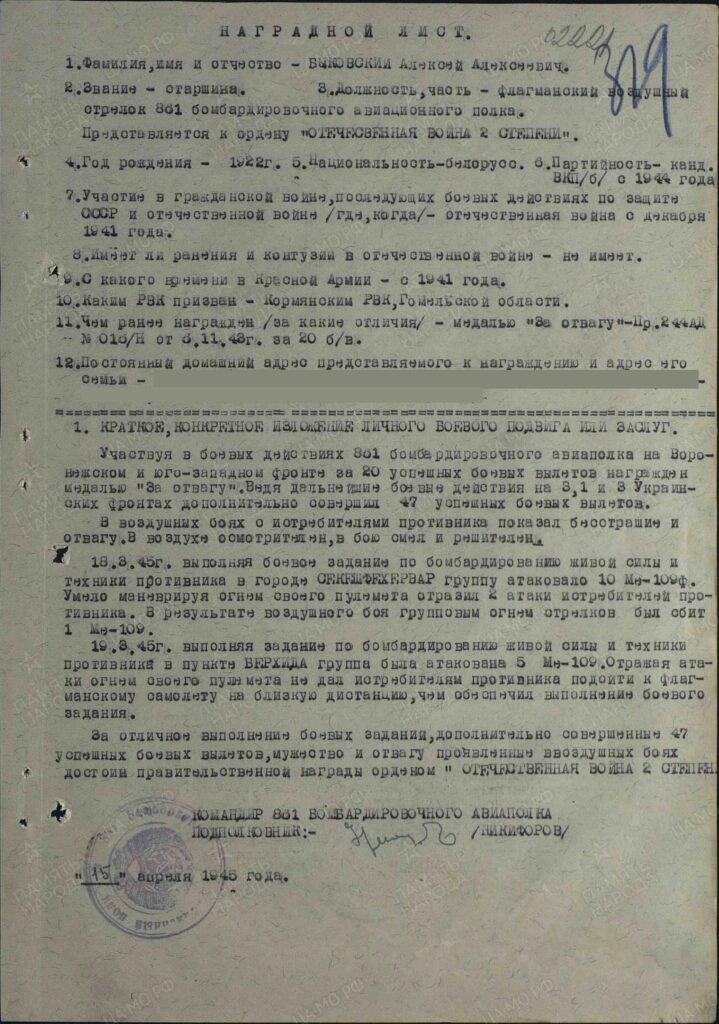Очередной наградной лист свидетельствует о новых подвигах ветерана: за 20 успешных боевых вылетов награждён медалью «За отвагу», ведя дальнейшие боевые действия на фронтах Великой Отечественной войны, дополнительно совершил 47 успешных боевых вылетов, при этом в воздухе был осмотрителен, но бесстрашен, смел и решителен. Так, 18 марта 1945 года при выполнении боевого задания по бомбардированию живой силы и техники противника в городе Секешфехевар группу атаковало 10 вражеских самолётов Ме‑109. Умело маневрируя огнём своего пулемёта, Быковский отразил две атаки немецких истребителей. В результате воздушного боя групповым огнём был сбит один Мессершмитт. На следующий день при выполнении боевого задания по бомбардированию живой силы и техники гитлеровцев группа была атакована пятью Ме‑109. Лётчик, отразив их атаку, не дал приблизиться истребителям фашистов к флагманскому самолёту на близкую дистанцию, чем обеспечил выполнение боевого задания. За проявленную доблесть Алексей Быковский был награждён орденом Отечественной войны II степени, который многим фронтовикам вручили лишь спустя 40 лет после Великой Победы.