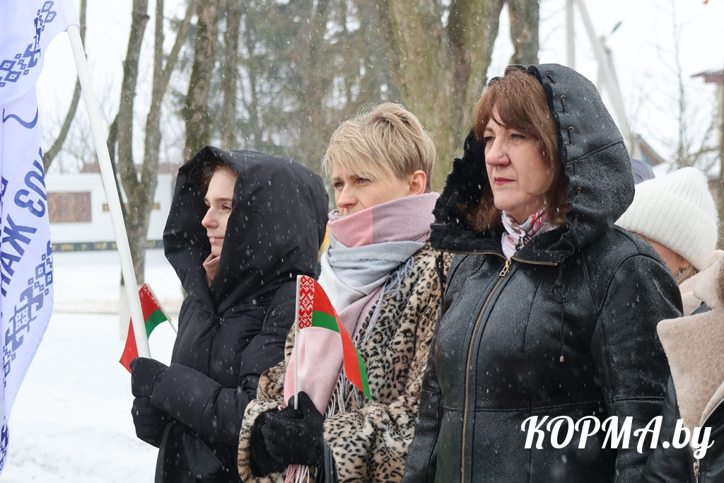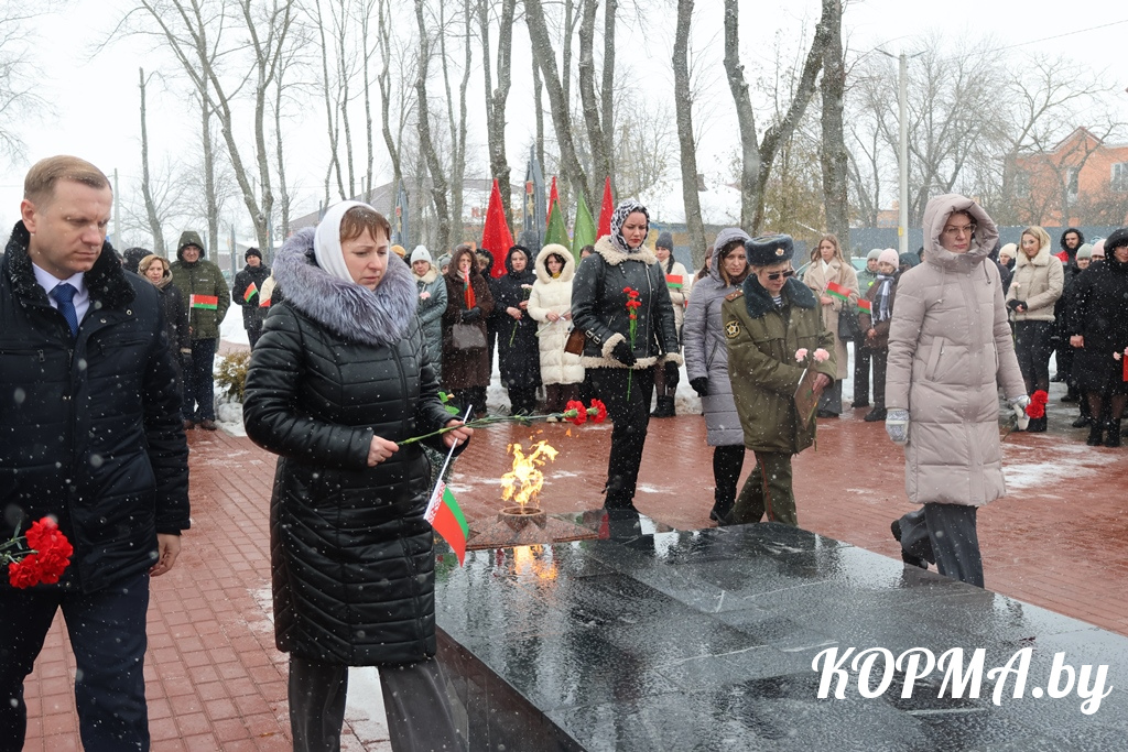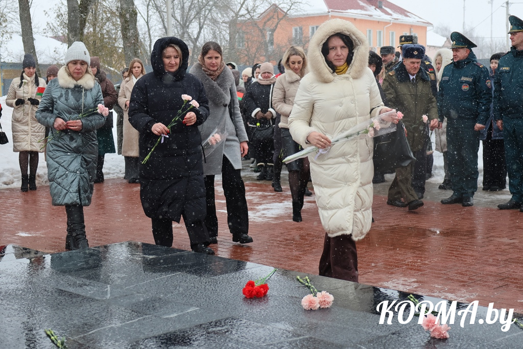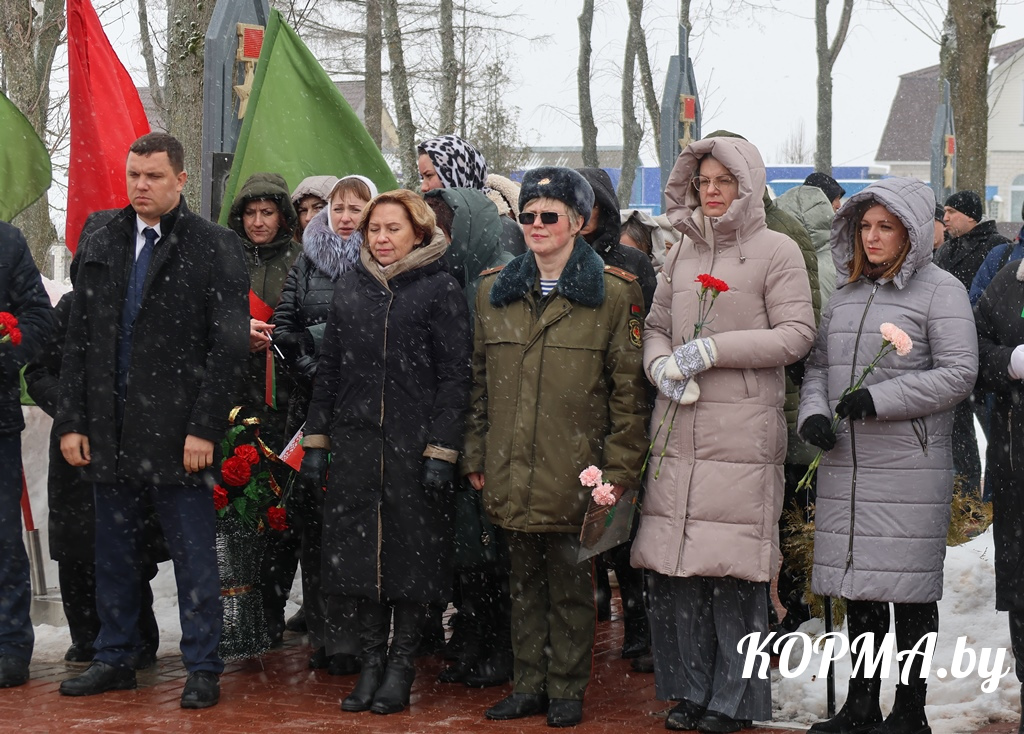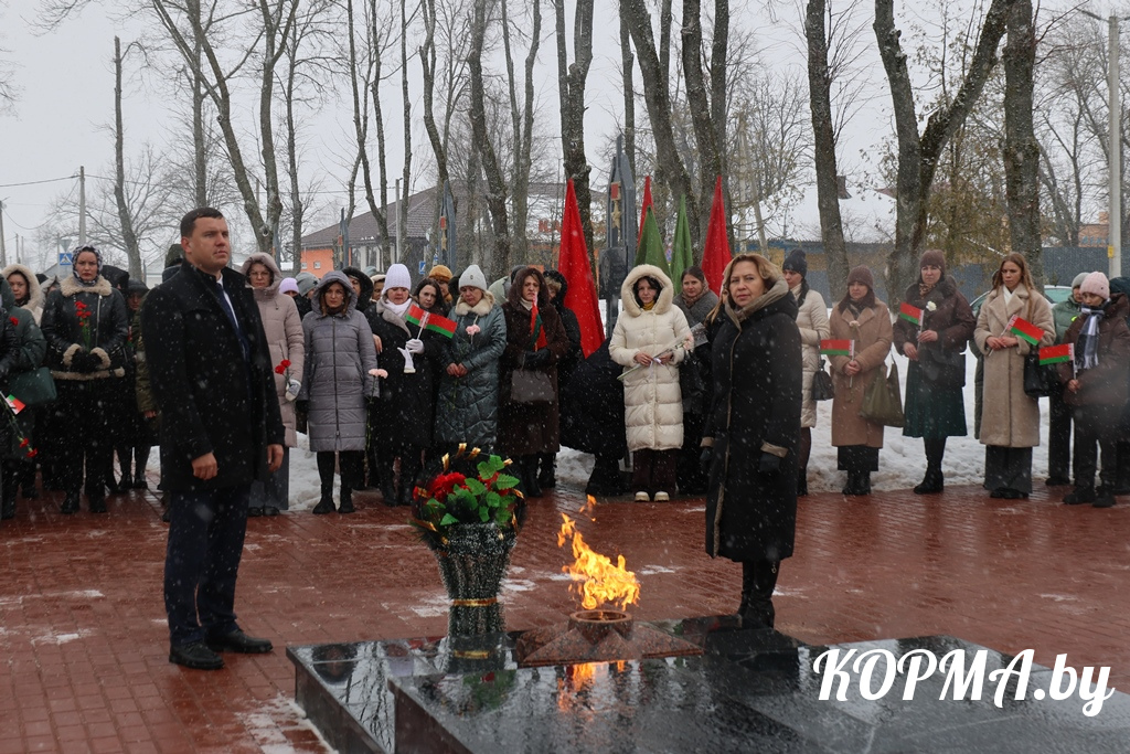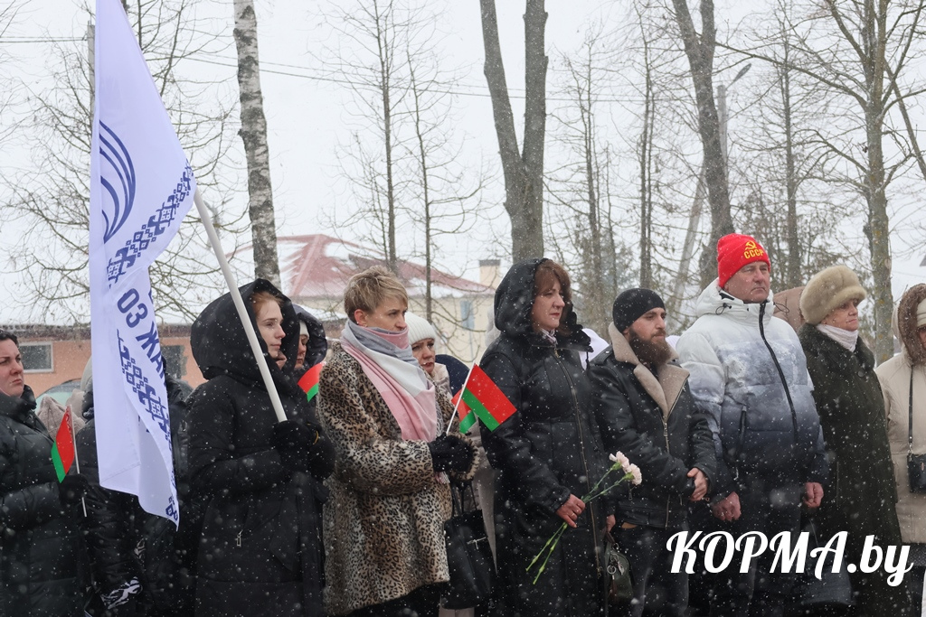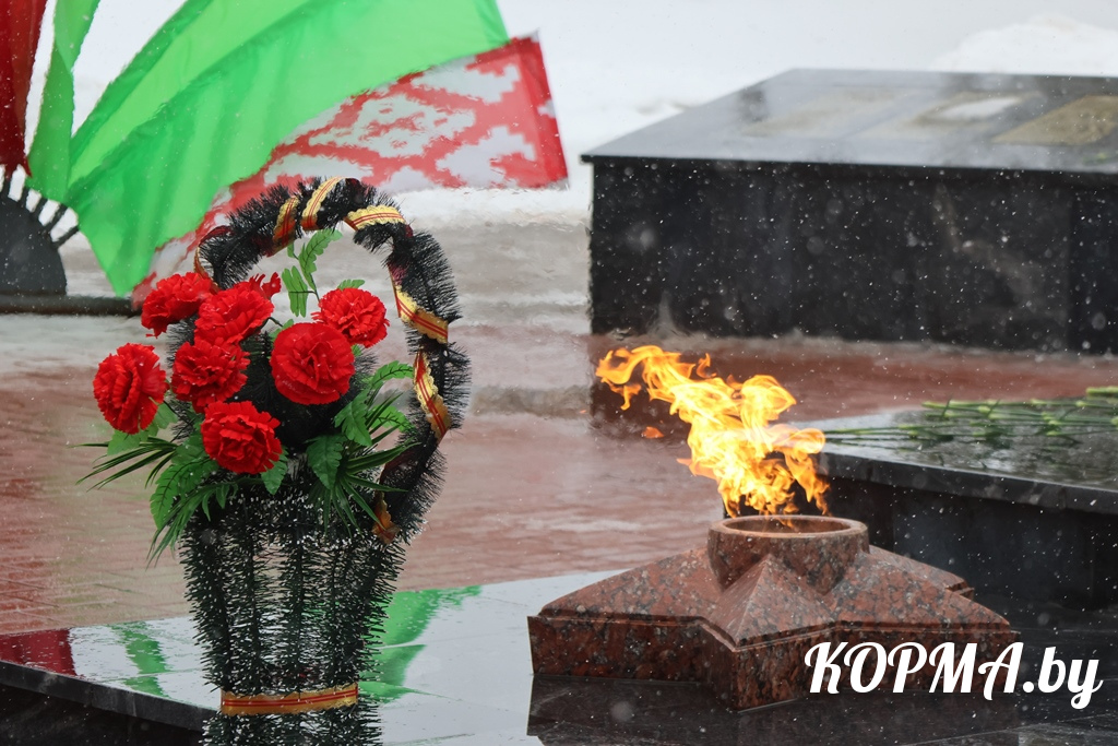 У памятника воинам-освободителям собрались представители местных органов власти, общественных организаций, члены трудовых коллективов и жители г. п. Корма.