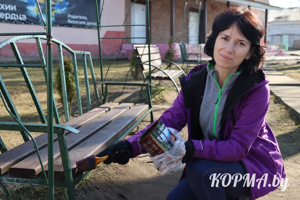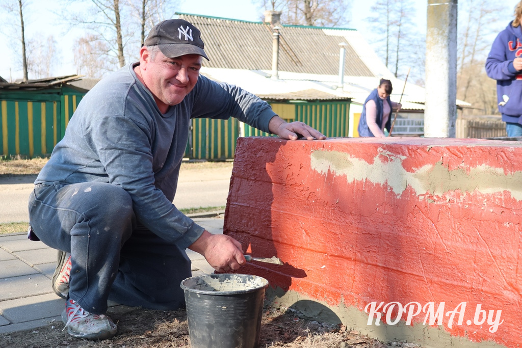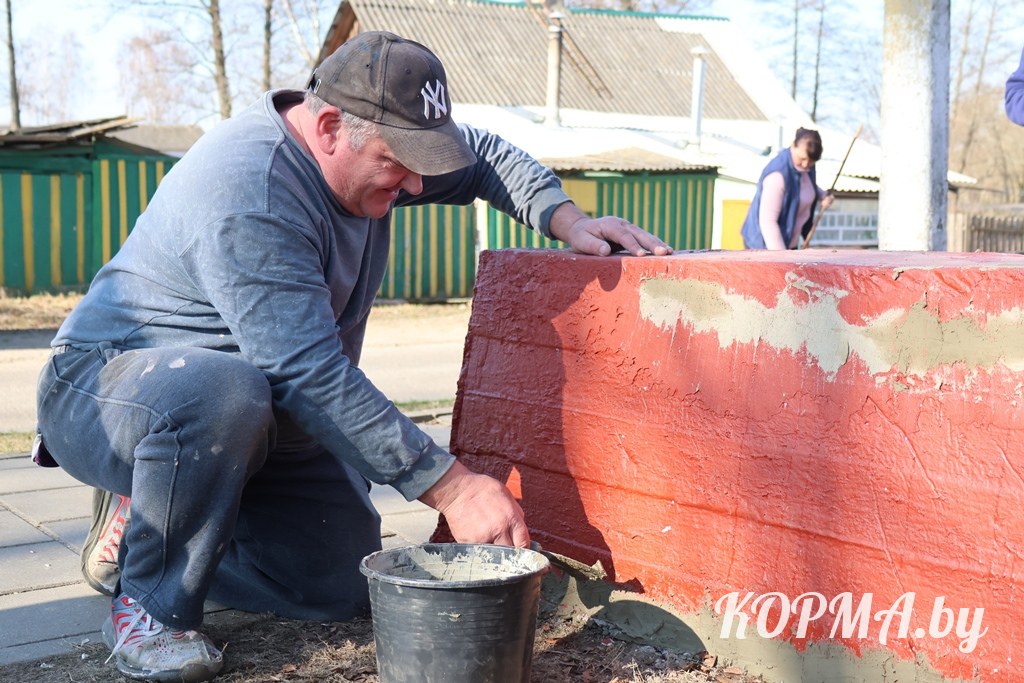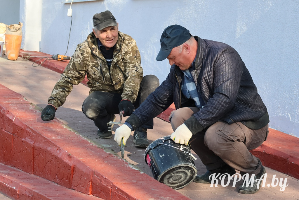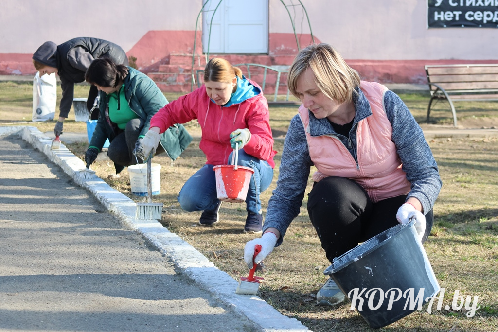 С самого утра работа кипела сегодня в агрогородке Литвиновичи. Работники Литвиновичского сельского Совета и районного мемориального музея дружно наводили порядок на прилегающих к административным зданиям территориях: белили деревья и бордюры, обновляли свежей краской скамейки, ремонтировали пандус и убирали сухую листву.