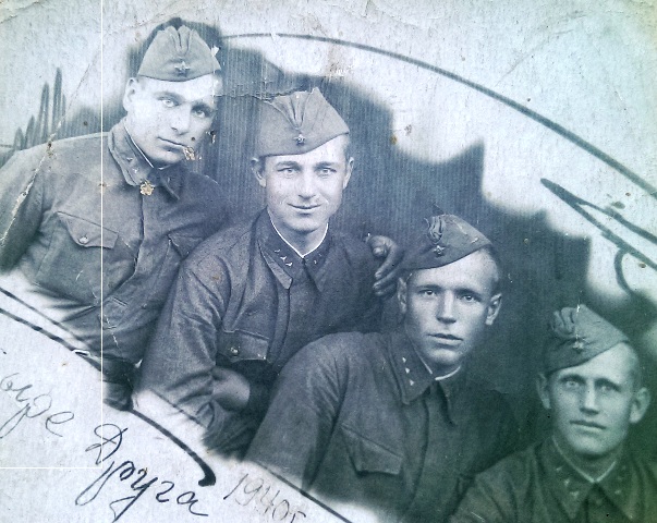 Не мог я не посетить самого младшего и единственного оставшегося в живых из всех братьев и сестер Николая Герасимовича, что живет в деревне Паново. Брат героя, которому в этом году исполнилось восемьдесят два года, поведал, что хорошо помнит, как в 1942 году Миша приезжал домой и привез ему «буденовку». Из семейного архива Николай Герасимович подарил довоенную фотографию М.Г. Калинкина, где рукой Героя Советского Союза написано «Четыре друга 1940 г». Как оказалось, все четверо ушли на войну и не вернулись. По моей просьбе сделали также копию единственной фотографии мамы героя – Прасковьи Егоровны Калинкиной.
