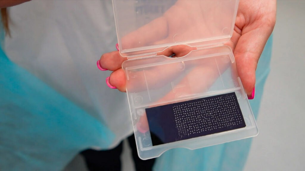 На нем находятся мельчайшие точки, которые содержат аллергены. Всего их 200 штук. На него наносится кровь пациента, а затем добавляются необходимые реагенты.