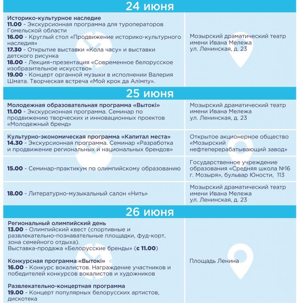 С 24 по 26 июня 2021 года культурно-спортивный фестиваль «Вытокі» состоится в Мозыре. Масштабный и яркий праздник уже прошел в Лиде, Орше и Кобрине, оставив много положительных эмоций у жителей этих регионов.