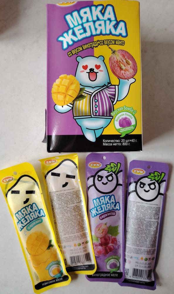 В реестр включено желе с вкусом манго и винограда «МЯКА ЖЕЛЯКА» марки ZVN, также произведенное в Китае. Этот продукт содержит запрещенную добавку — подсластитель цикломат натрия. Кроме того, были выявлены проблемы с маркировкой упаковки.
