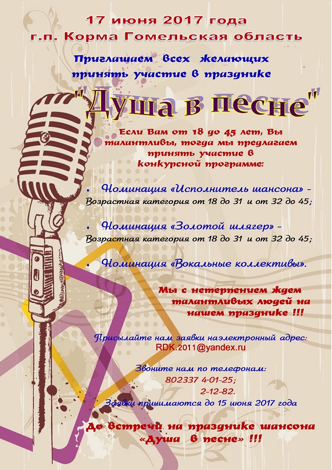 Красивый, душевный, музыкальный, а главное всем полюбившийся праздник шансона «Душа в песне» в субботу вновь пройдет в нашем районе. На сцене, организованной на Центральной площади Кормы, соберутся лучшие вокалисты этого жанра, чтобы порадовать зрителей своим исполнением и принять участие в этом творческом состязании. Напомню, что это мероприятие уже стало традиционным для нашего района, а в последние годы прибрело статус международного. Артисты с большим удовольствием посещают наш край, где их ожидают преданные поклонники.