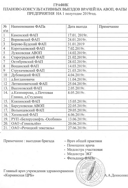 ГРАФИК ПЛАНОВО-КОНСУЛЬТАТИВНЫХ ВЫЕЗДОВ ВРАЧЕЙ НА АВОП, ФАПЫ ПРЕДПРИЯТИЯ НА 1 полугодие 2019год.
