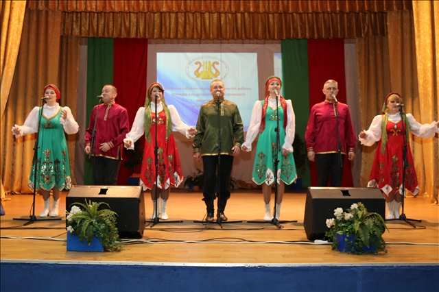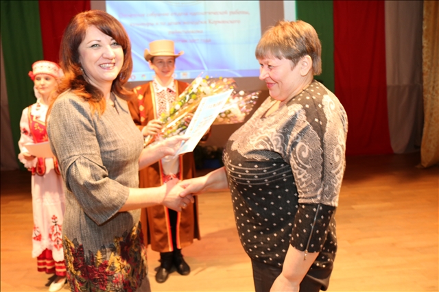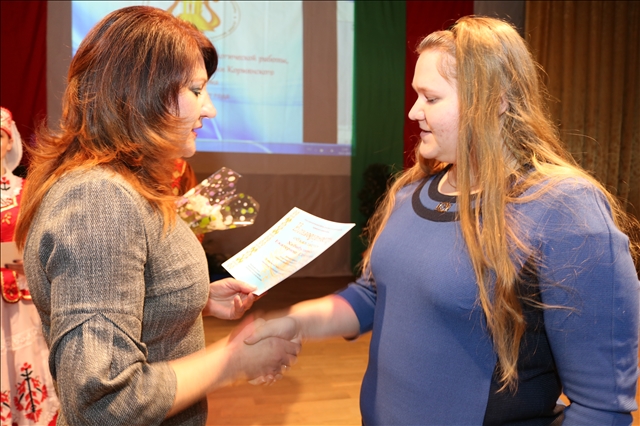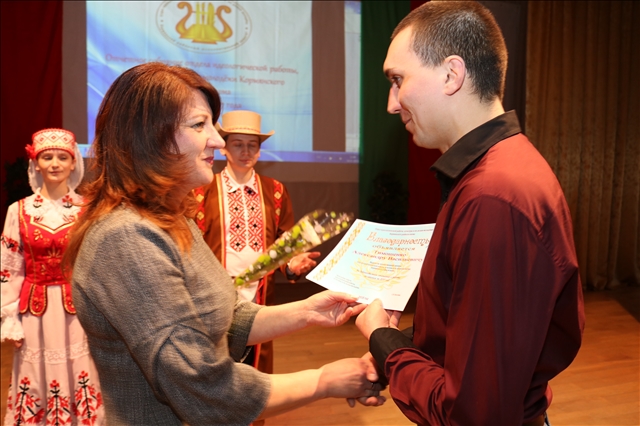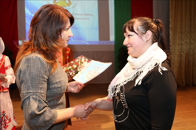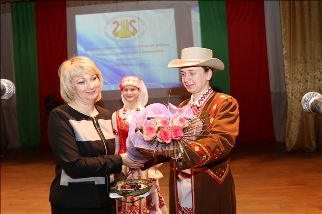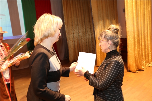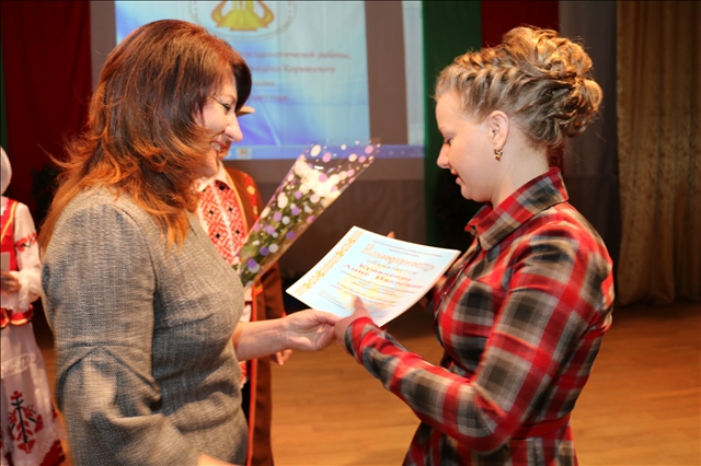 Далее наступил торжественный момент награждения. Наталья Игоревна вручила Почетную грамоту главного управления идеологической работы, культуры и по делам молодежи Гомельского облисполкома директору районного музея Алле Балыш, Благодарность главного управления идеологической работы, культуры и по делам молодежи Гомельского облисполкома методисту ЦКиД Людмиле Соломиной, Благодарность районного Совета депутатов руководителям народного любительского коллектива «Кармянскія прымакі» Александру Соломину и народного коллектива «Славянская душа» Татьяне Митковец.