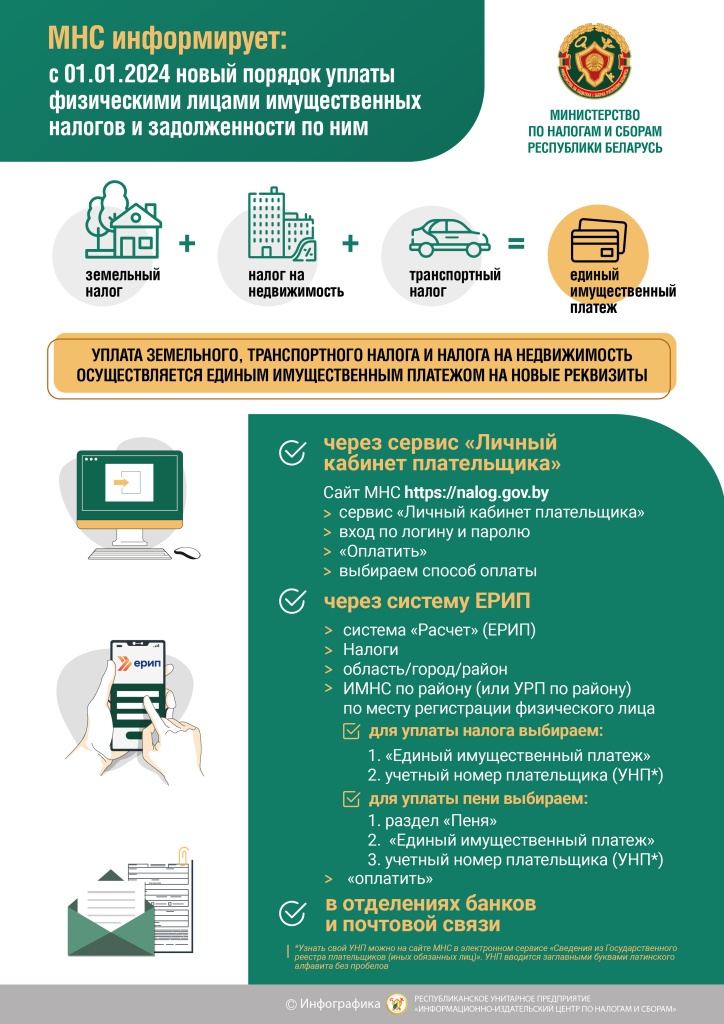 С 1 января 2024 г. с целью упрощения порядка уплаты имущественных налогов, а также создания комфортных условий для плательщиков вводится новый порядок уплаты физическими лицами транспортного, земельного налогов и налога на недвижимость (имущественные налоги).Так, с 1 января 2024 г. уплата имущественных налогов производится единым имущественным платежом на один бюджетный счет по адресу регистрации (прописки) физического лица.