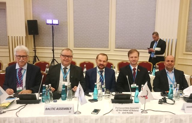 В ходе пленарного заседания мне было предоставлено слово, в котором я отметил, что представляю Парламентское Собрание Союза Беларуси и России. Союзное государство, по мнению экспертов, является эффективным интеграционным образованием, ставшим прообразом и моделью Евразийского экономического союза. Наш Союз – положительный пример реализации принципа интеграции интеграций. Он имеет свой бюджет, парламентское измерение, действенную структуру исполнительных органов. Во многом такой уровень взаимодействия достигнут благодаря постоянной совместной работе белорусских и российских парламентариев.