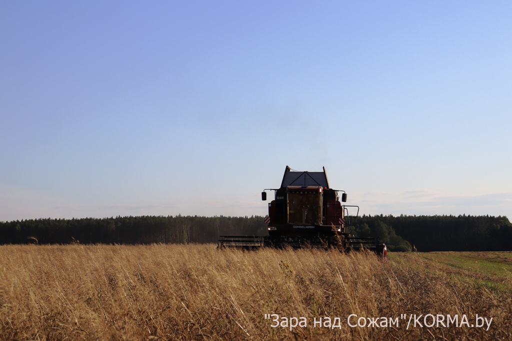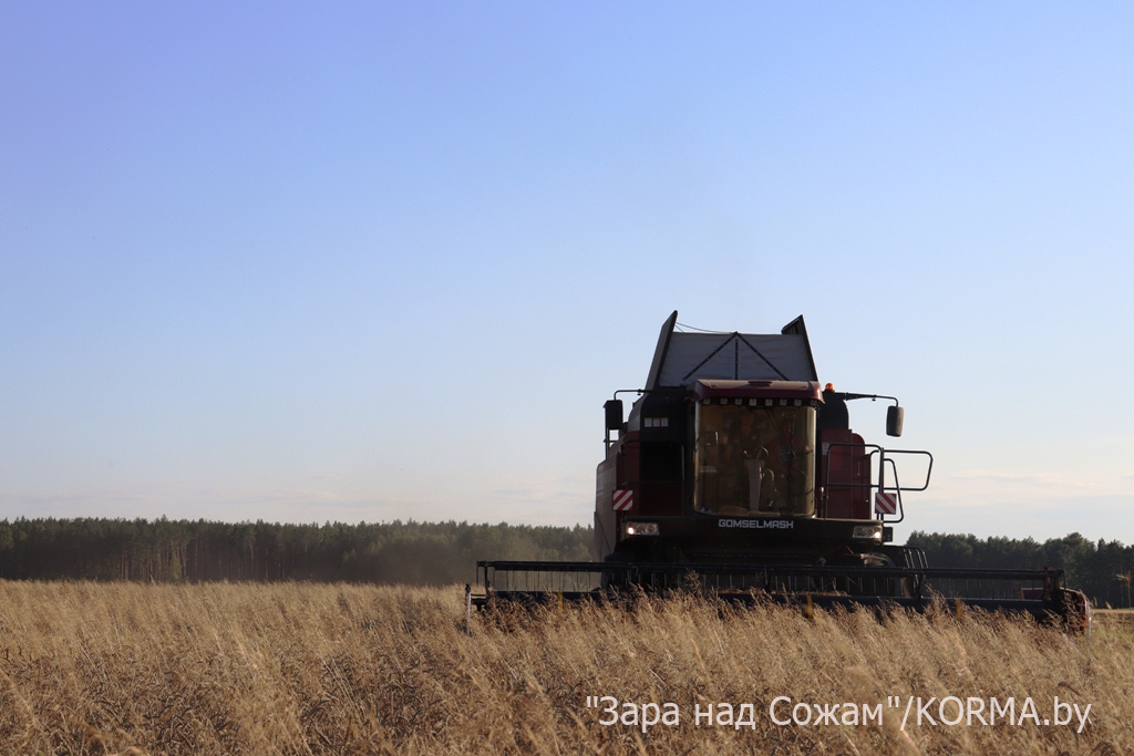 На часах 19.47, а по полю туда-сюда снуёт яркая красная машина со знакомой каждому белорусу надписью «Гомсельмаш».