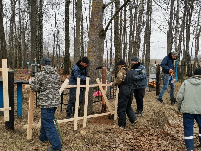 Работники Каменского сельсовета, библиотеки и клуба совместно с спасателями ОСВОД занимаются благоустройством и наведением порядка на кладбище в деревне Каменка. Вместе работа идёт веселее и активнее.