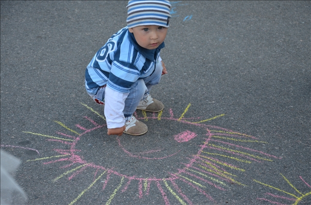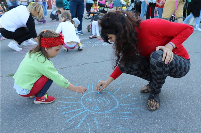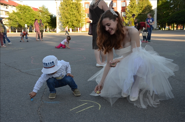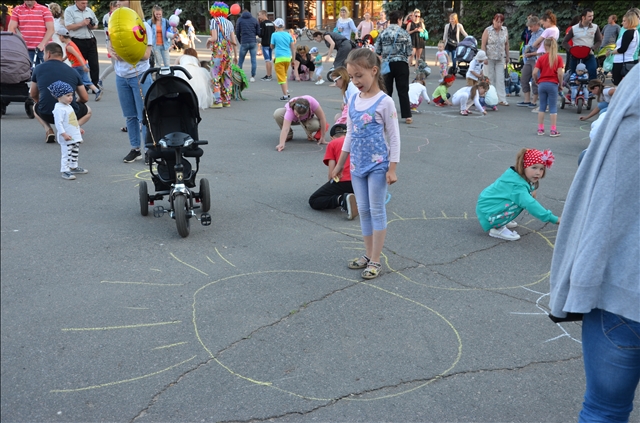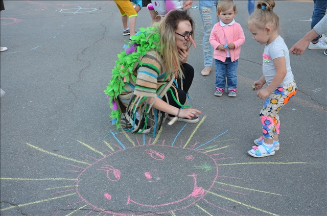 Уже по окончанию веселой сказки, всех присутствующих пригласили на центральную площадь, чтобы нарисовать мелками на асфальте большое солнце и много маленьких солнышек, а сказочные герои им в этом помогали.
