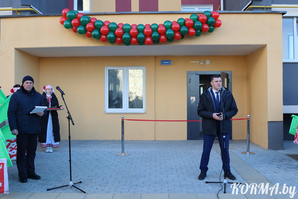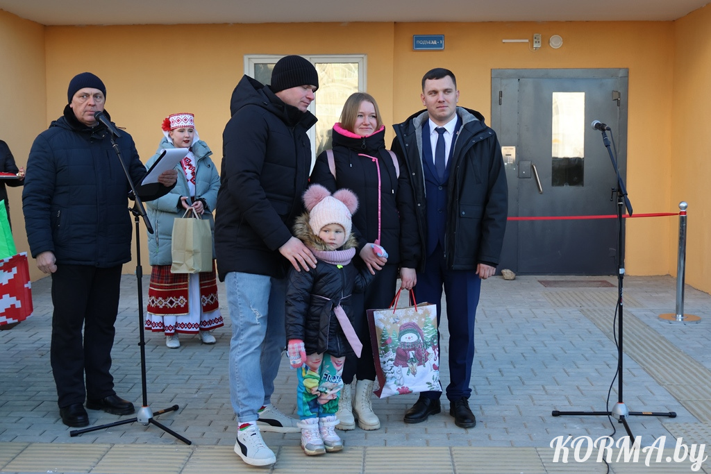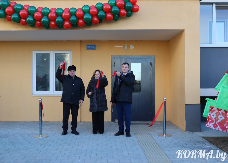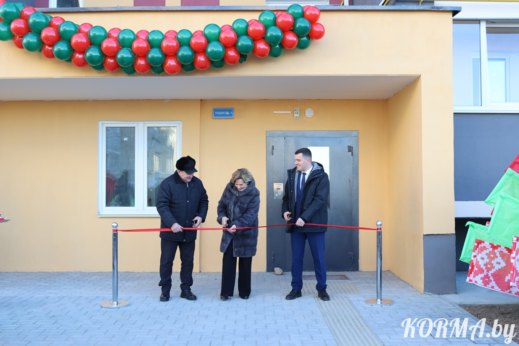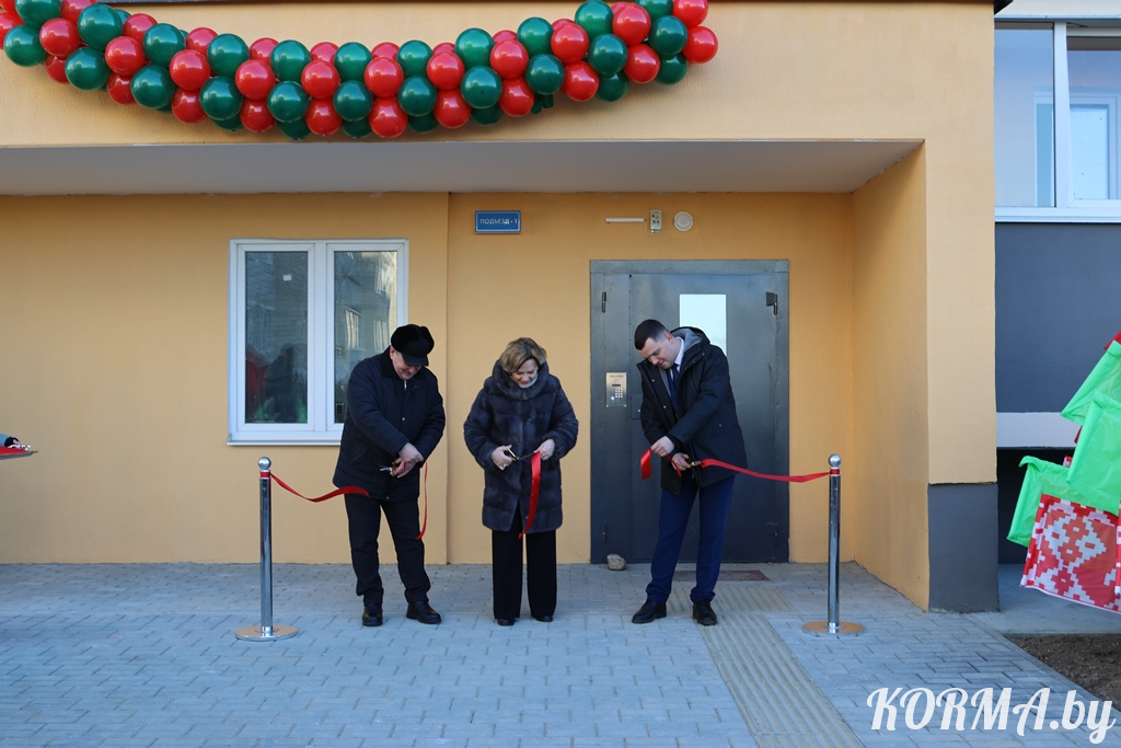 Главным новогодним подарком у новосёлов по адресу: г. п. Корма, улица Советская, 1а стали новенькие, просторные и светлые квартиры. Сегодня в Корме торжественно перерезали ленточку в недавно построенном многоэтажном доме, рассчитанном на сорок квартир. Участие в торжественной церемонии принял председатель Кормянского райисполкома Дмитрий Шинкаренко и председатель Кормянского районного Совета депутатов Татьяна Шехтер.