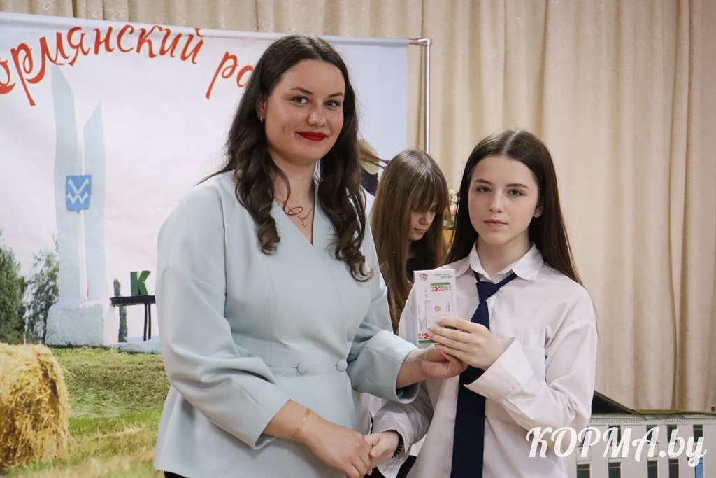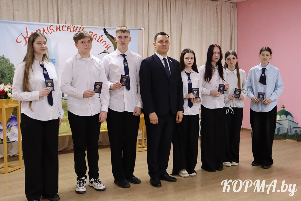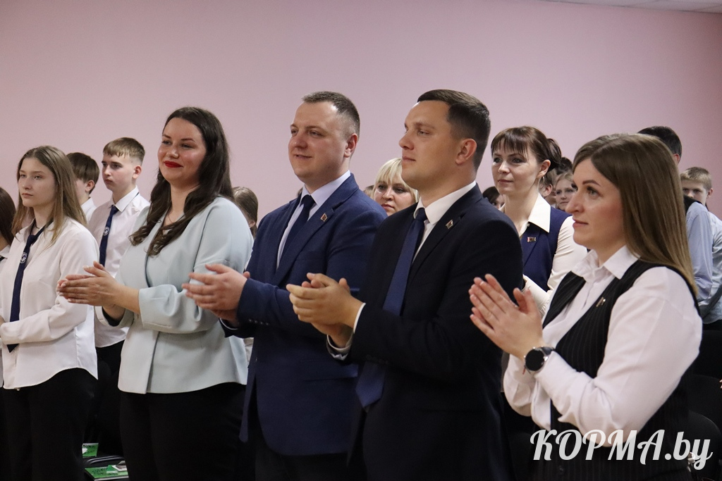 Первый секретарь Кормянского районного комитета ОО «БРСМ» Анастасия Шмурадко вручила билеты и значки Белорусского республиканского союза молодёжи учащимся учреждений образования Кормянского района. Торжественное мероприятие сопровождалось музыкальными номерами педагогов Кормянского районного центра творчества детей и молодёжи и их учащихся, которые подарили гостям и участникам праздника яркие и запоминающиеся выступления.