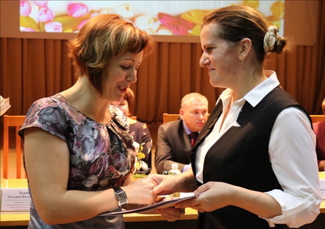 Из рук Натальи Евтуховой и Натальи Казаковой заслуженные награды – Грамоты отдела образования, спорта и туризма райисполкома и Грамоты районной организации Белорусского профсоюза работников образования и науки получили: учитель физкультуры Лужковской школы Александр Якутович; учитель начальных классов средней школы № 1 Людмила Усик; учитель химии и биологии Хизовской школы Валентина Маевская; помощник воспитателя яслей-сада № 2 Светлана Калоша; приемные родители Любовь Семченко и Людмила Чистякова; учитель истории и обществоведения средней школы №1 Инна Головнева; учитель начальных классов средней школы № 1 Оксана Глаздовская; учитель русского языка и литературы гимназии Ирина Браздова; учитель начальных классов Боровобудской школы Наталья Богданович; председатели первичных профсоюзных организаций яслей-сада №2 Светлана Супиченко, Ворновской школы Наталья Сапего, Каменской школы Галина Лукашенко; учитель физкультуры Коротьковской школы Евгений Быковский; учитель математики и информатики Барсуковской школы Сергей Казак; заместитель директора по воспитательной работе Литвиновичской школы Татьяна Коваленко.