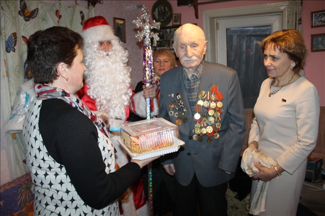 Председатель Кормянского районного Совета депутатов Татьяна Шехтер вместе с депутатом Палаты представителей Национального собрания Республики Беларусь Владиславом Щеповым и заместителем председателя правления Кормянского райпо Лидией Власовой, председателем районного совета ветеранов Ларисой Ланюговой в сопровождении Деда Мороза и Снегурочки приехали с новогодними поздравлениями и подарками к ветерану Великой Отечественной войны, Почетному гражданину Кормянского района Владимиру Иосифовичу Альшевскому.