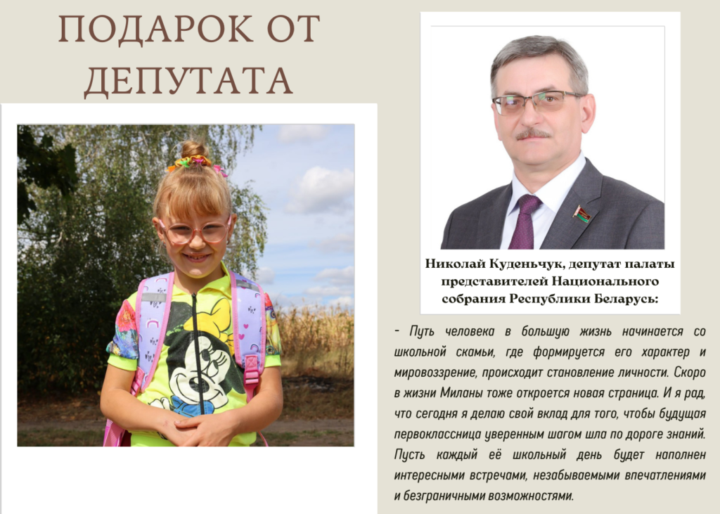 К республиканской акции «Соберем портфель вместе» присоединился депутат Палаты Представителей Национального собрания Республики Беларусь Николай Куденьчук. От его имени самый главный атрибут каждого школьника получила юная первоклассница Милана. Девочка проживает в многодетной семье, где воспитывается пять малышей.