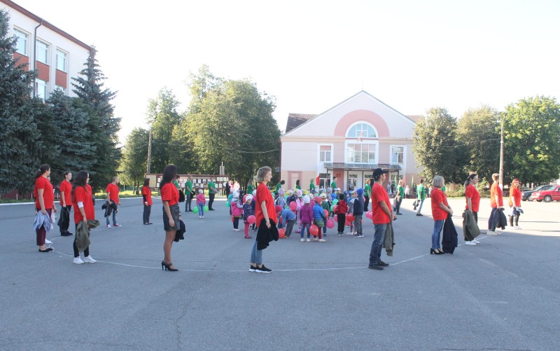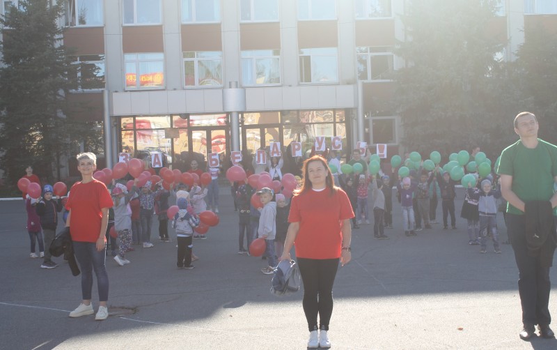 На асфальте участники флеш-моба образовали живое сердце, бьющееся за родную, мирную, любимую Беларусь. Абрис его составляли молодые люди, а внутри, как живая кровь, суетились и пульсировали дети с красными и зелёными воздушными шариками.