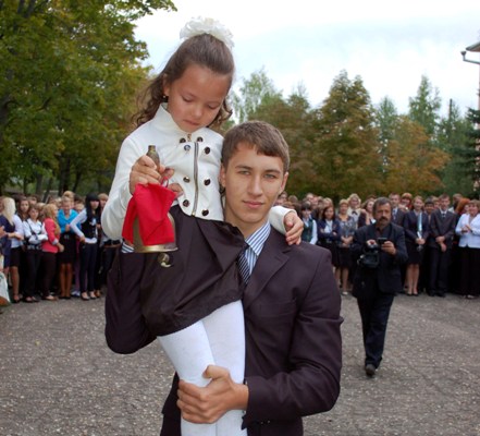 Ученик 11 «А» класса Эдуард Гайков как пушинку поднял на плечо ученицу 1 «А» класса Каролину Акинчиц и совершил почетный круг по школьному двору с колокольчиком. Учебный год начался.