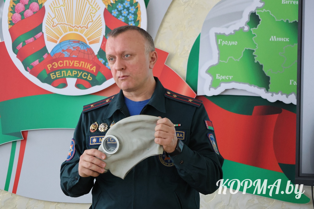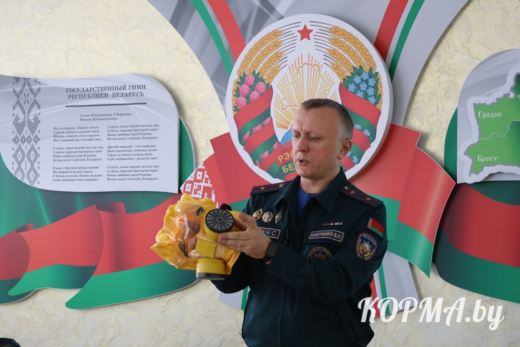 Старший инженер сектора организации функционирования государственной системы предупреждения и ликвидации чрезвычайных ситуаций и гражданской обороны Кормянского РОЧС Владимир Цыкуненко, подробно рассказал о правилах безопасного поведения при техногенных авариях, чрезвычайных происшествиях и природных катастрофах, а также о предупредительном сигнале «Внимание всем!». Разобрали порядок действий, если такой сигнал прозвучит. В ходе беседы было продемонстрировано специальное оборудование, которое может использоваться для защиты органов дыхания и зрения.