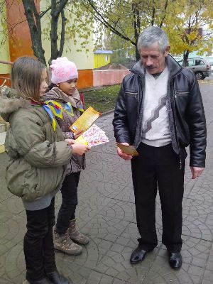 На третьем этапе акции возле районного дома творчества детей и молодежи представители БМООСП рассказывали прохожим о деятельности своей организации.