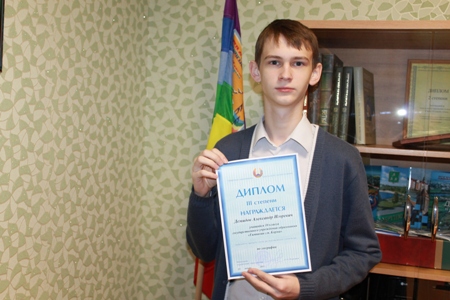 Диплом III степени получил учащийся 10 класса гимназии г.п. Корма Александр Демидов.