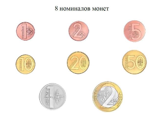 С 1 июля 2016 года впервые в новейшей истории Республики Беларусь в наличном денежном обращении появятся металлические монеты. Всего восемь номиналов монет – 1, 2, 5, 10, 20 и 50 копеек, а также 1 и 2 рубля.