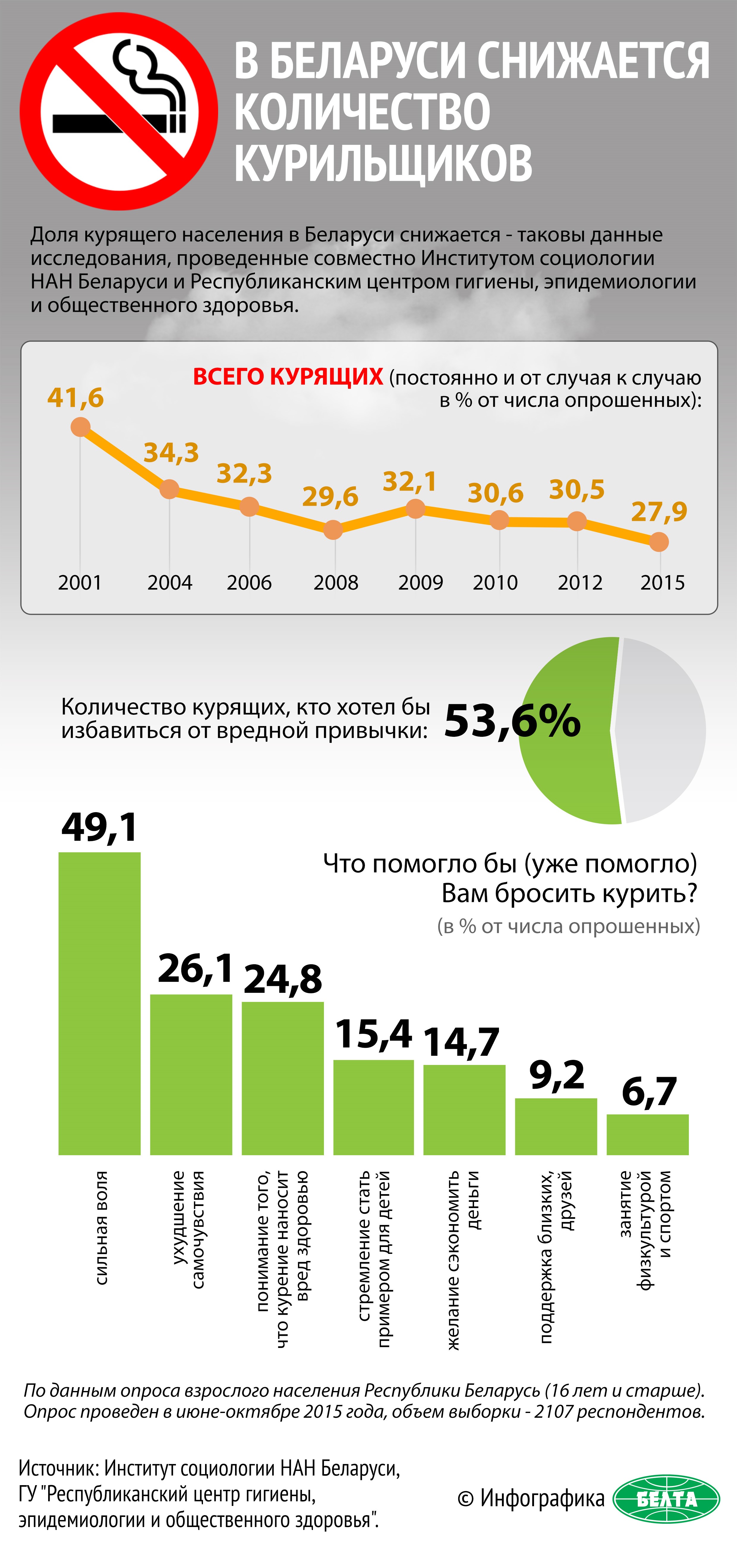 В большинстве стран Европы доля взрослого населения, курящего ежедневно, находится в пределах 20-30% (по последним данным ВОЗ). В Латвии, Литве, Польше и Украине уровень распространенности ежедневного курения составил от 25% до 30%. В Беларуси, по данным социологического исследования 2015 года, курит почти 28%.