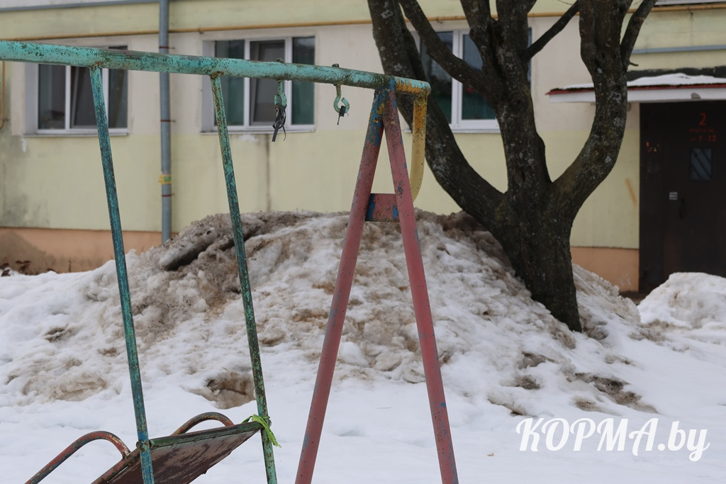 Сразу два атрибута игровой площадки попали в поле зрения журналистов районной газеты. На каждой из качелей отсутствует крепление и сиденье. Возможно, здесь постарались недоброжелатели или истёк срок эксплуатации качелей, и они отвалились. Но сейчас проблема заключается в том, что к весне детскую площадку нужно привести в соответствие.