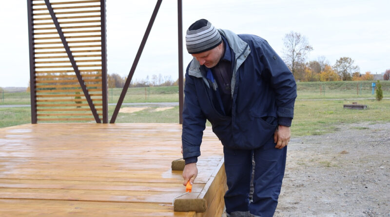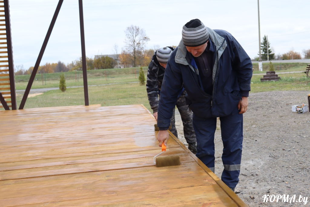 Вот и в агрогородке Барсуки не просто наводят порядок на территории, но уже и начали готовиться к будущему районному празднику тружеников села «Дожинки-2026». Здесь в самом центре установили современную сцену и скамейки для зрителей. К слову, всё это выполнено из металла и натурального дерева, покрытого специальными средствами, позволяющими защитить материал от непогоды. Смотрится всё весьма стильно и аккуратно. И обязательно будет задействовано не раз на многочисленных праздниках и мероприятиях, которыми славится Барсуковская земля.