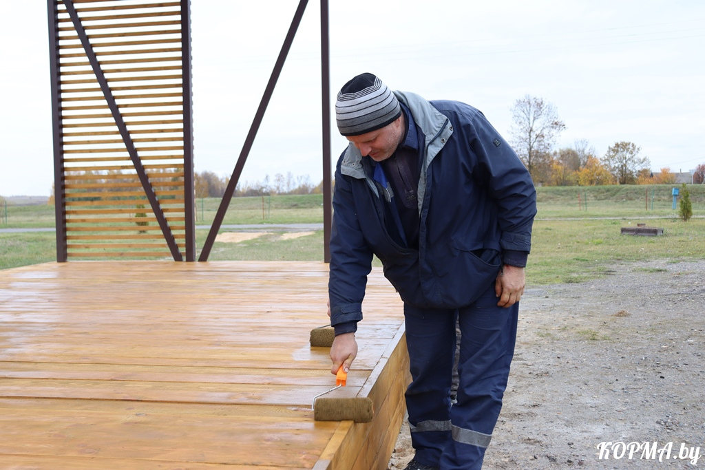Вот и в агрогородке Барсуки не просто наводят порядок на территории, но уже и начали готовиться к будущему районному празднику тружеников села «Дожинки-2026». Здесь в самом центре установили современную сцену и скамейки для зрителей. К слову, всё это выполнено из металла и натурального дерева, покрытого специальными средствами, позволяющими защитить материал от непогоды. Смотрится всё весьма стильно и аккуратно. И обязательно будет задействовано не раз на многочисленных праздниках и мероприятиях, которыми славится Барсуковская земля.