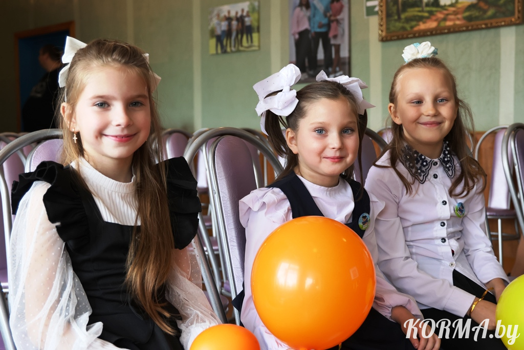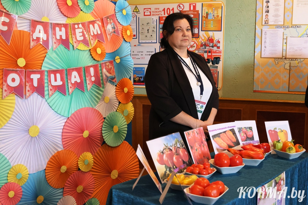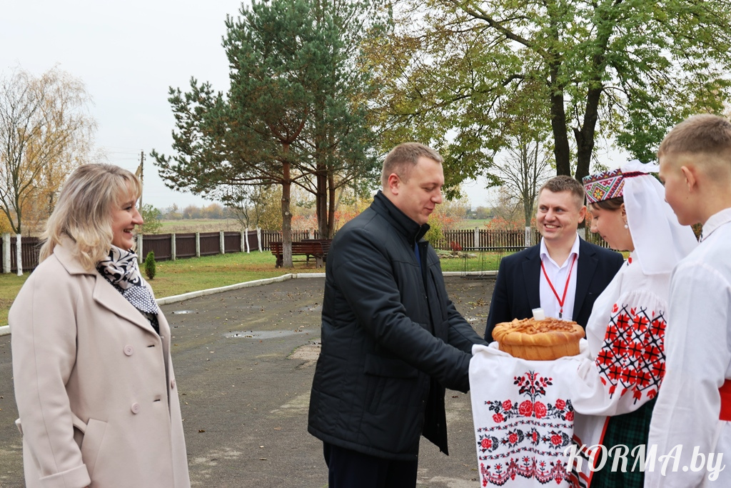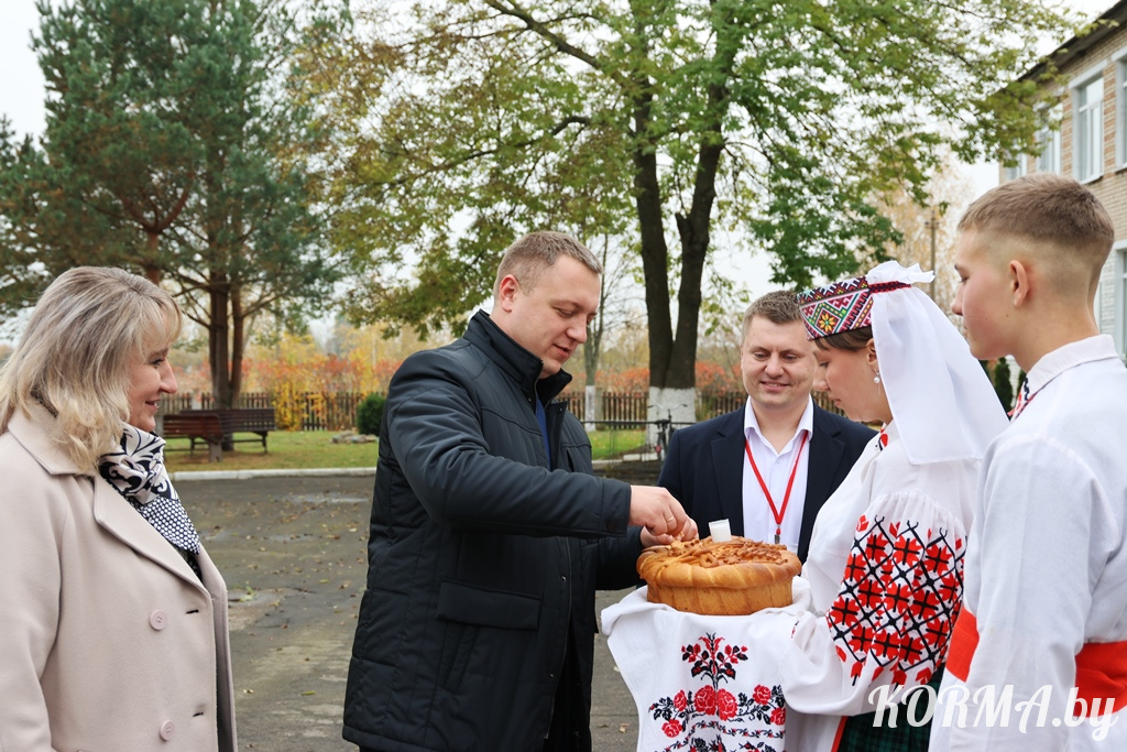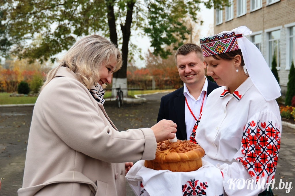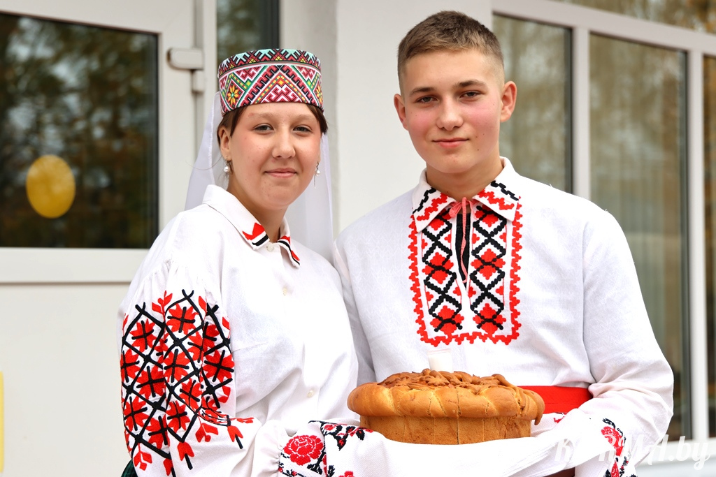 Уже на входе в учреждение образования для гостей учащиеся и педагоги подготовили разнообразные выставки. По традиции ребята, наряженные в белорусские национальные костюмы, встречали всех, кто пришёл на праздник, ароматным караваем.