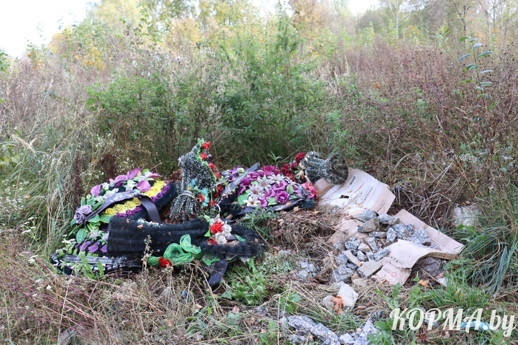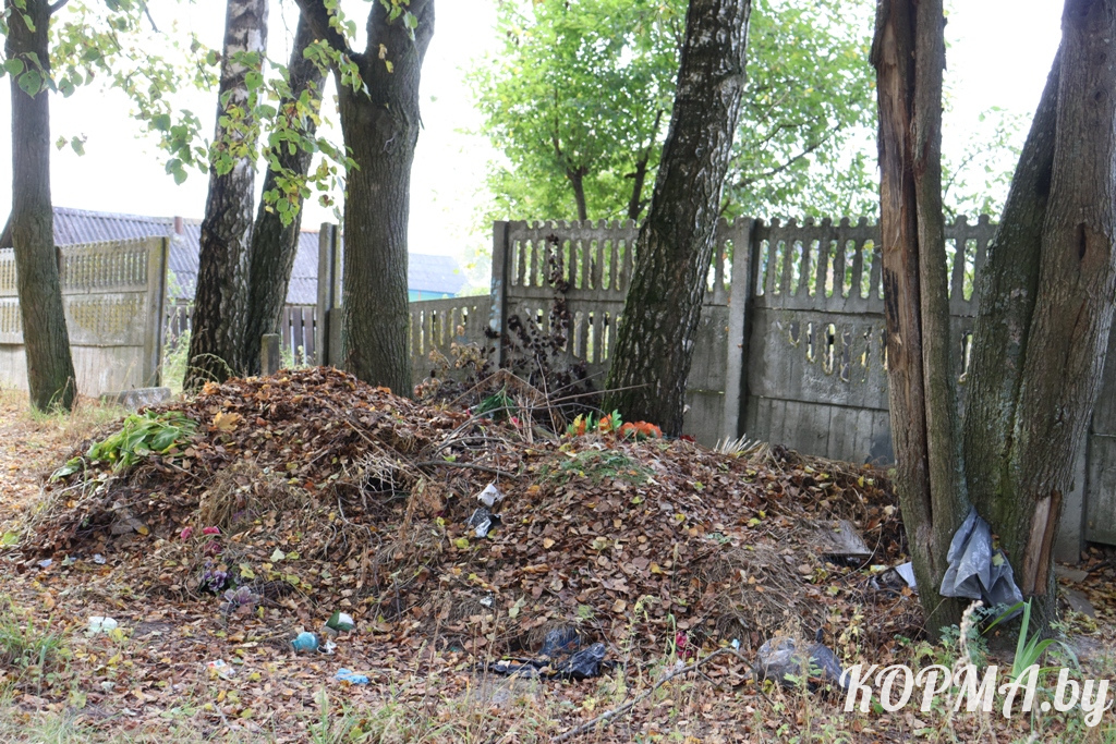 Вот и сейчас на центральном кладбище г. п. Корма есть несколько мест, где собрана опавшая листва, увядшие цветы, трава, старые венки и пластиковые букеты. И даже валяются фрагменты разбитых памятников, в том числе и со стелами. Неужели устаревший символ памяти при установке нового оказалось сложно закопать на том же участке? Всё это со временем накапливается, превращаясь в стихийные свалки. Одна из них находится прямо у центрального входа. Другие – вдоль дороги и на окраине кладбища. И если оттуда до контейнеров далековато, то оставлять мусор на виду у всех, кто пришёл посетить могилы близких, у погребальных процессий – просто недопустимо.