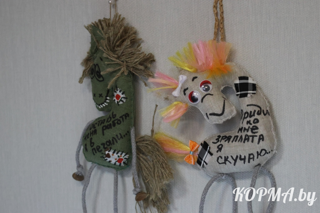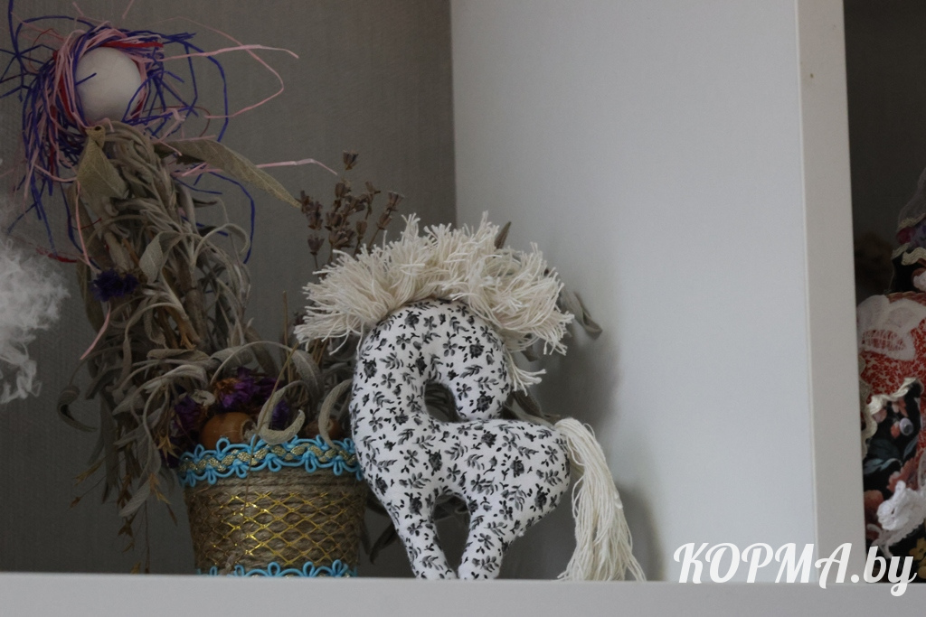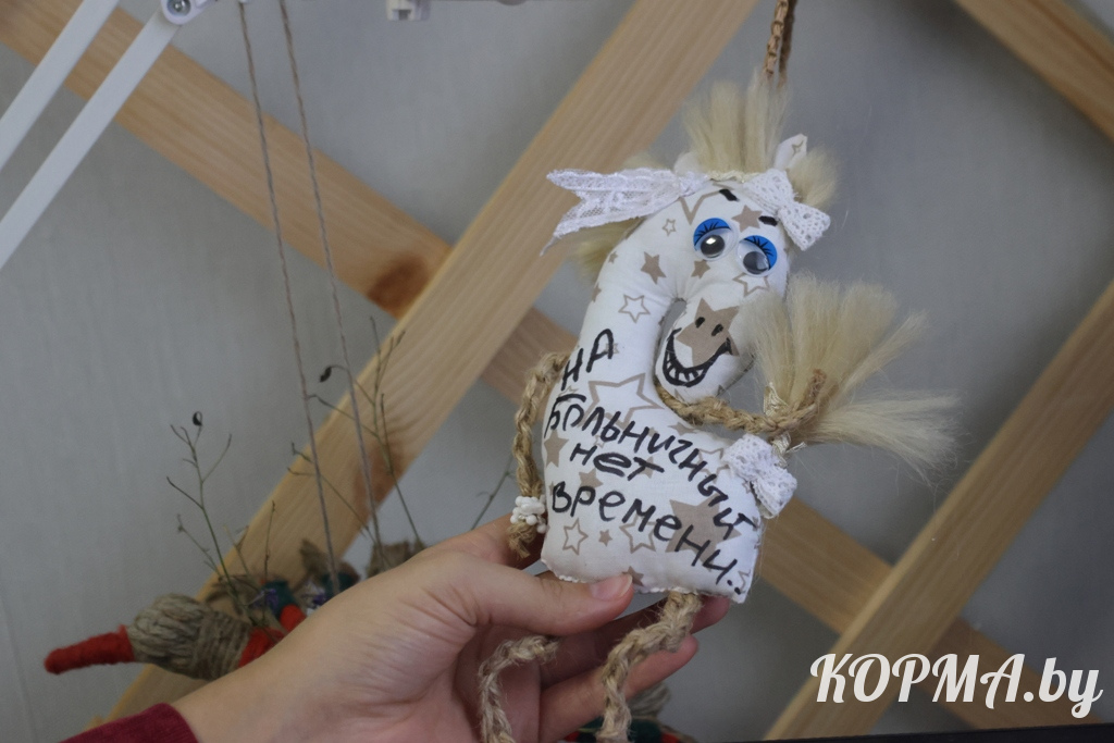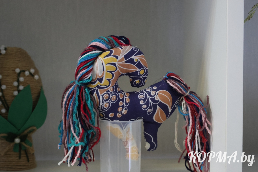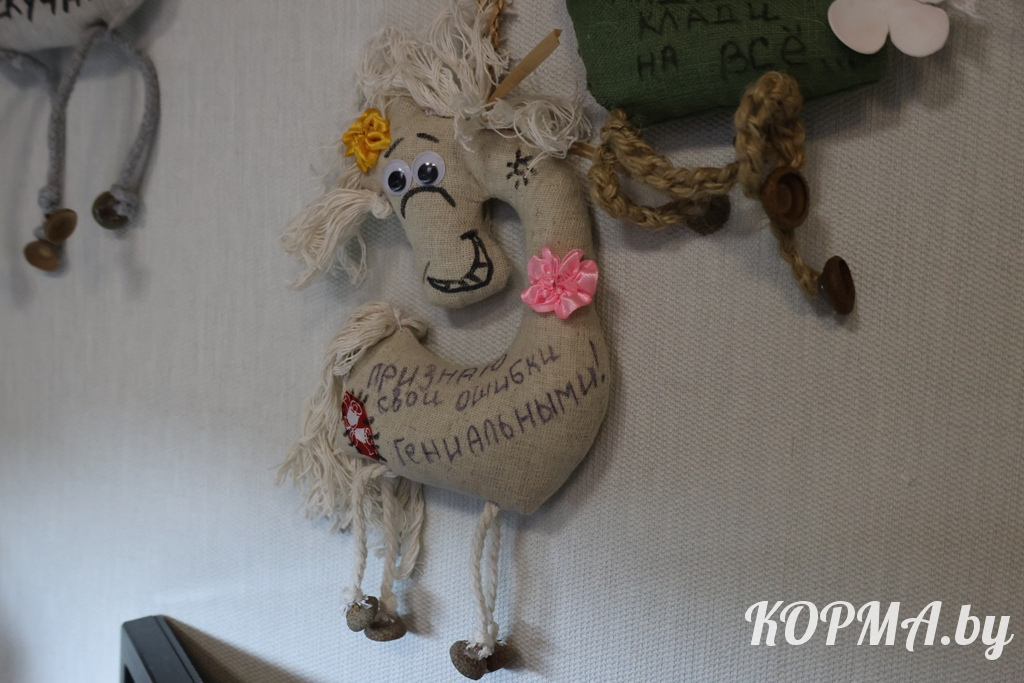 Атмосфера здесь, конечно, волшебная. Что ни изделие, то уникальный экспонат. Фигурки из различных материалов, выполненных в самых различных техниках, о которых, возможно, некоторые из нас даже и не слышали. Всё такое оригинальное, что, наверное, могло бы украсить любой интерьер и привнести нотку уюта в каждый дом. А что же больше всего привлекло наше внимание? Забавные лошадки с различными весёлыми надписями, которые с таким трепетом и любовью шьёт Эдита Ивановна. Почему именно лошади?
