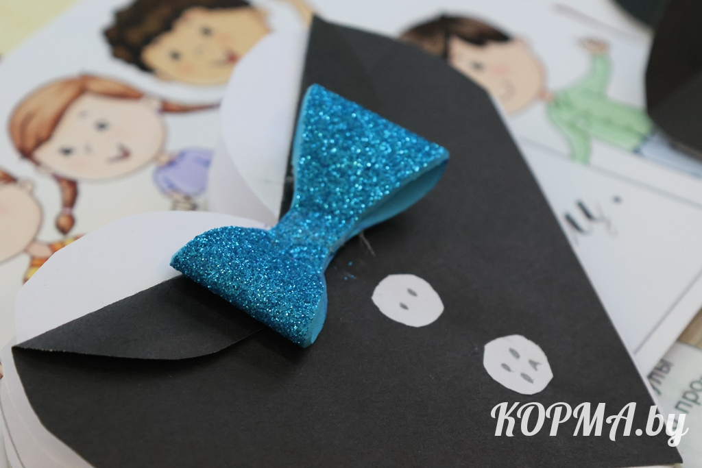 Девчоночки и мальчишки написали письмо-послание своим папам. Получилось весьма забавно, ведь каждый из них постарался выразить свои чувства и пожелания родному человеку. В праздничные дни положено дарить своим близким подарки. Гимназисты уверены, что нет ничего лучше, чем подарок, сделанный своими руками. На классном часу они с особой любовью изготовили памятные открыточки, украшенные элегантным смокингом. Яркий элемент – бабочка и пуговицы. У ребят получился настоящий костюм, под которым спрятались самые трогательные и тёплые слова с пожеланиями. Очередной повод для радости подготовили своим папам подготовили дочки и сыночки.