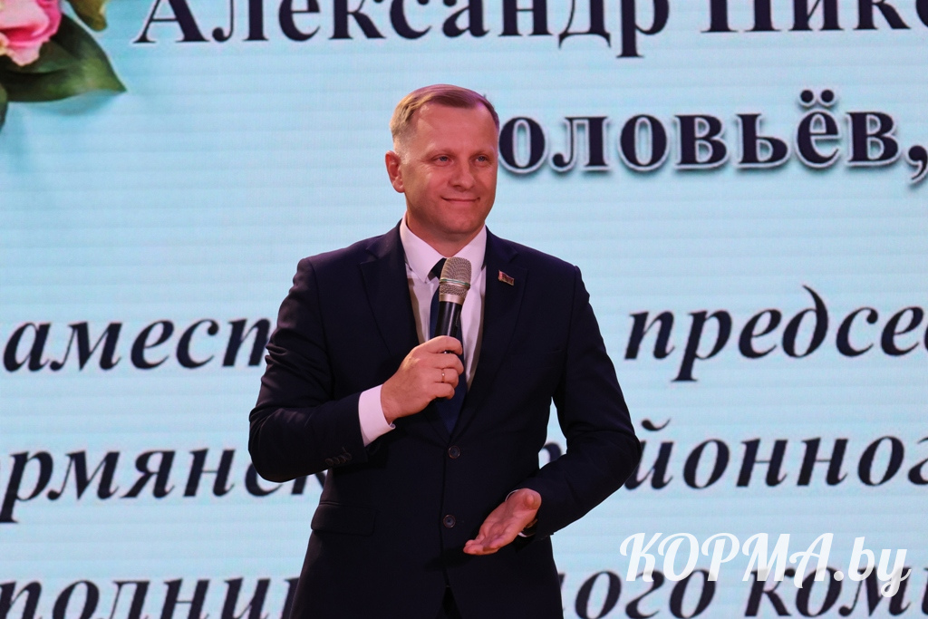 Александр Соловьёв, заместитель председателя Кормянского районного исполнительного комитета. Александр Николаевич Соловьёв обращаясь с поздравлением к педагогам отметил профессиональные качества, стойкость, целеустремленность каждого учителя сидящего в зале, пожелав каждому из них высоких результатов в работе, мира и добра.