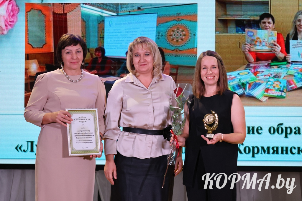 В номинации «Социальное партнёрство»сертификатом и кубком был награжден коллектив государственного учреждения образования «Лужковской базовой школы Кормянского района». Заслуженную награду вручила Наталья Казакова, председатель Кормянской районной организации профессионального союза работников образования и науки.